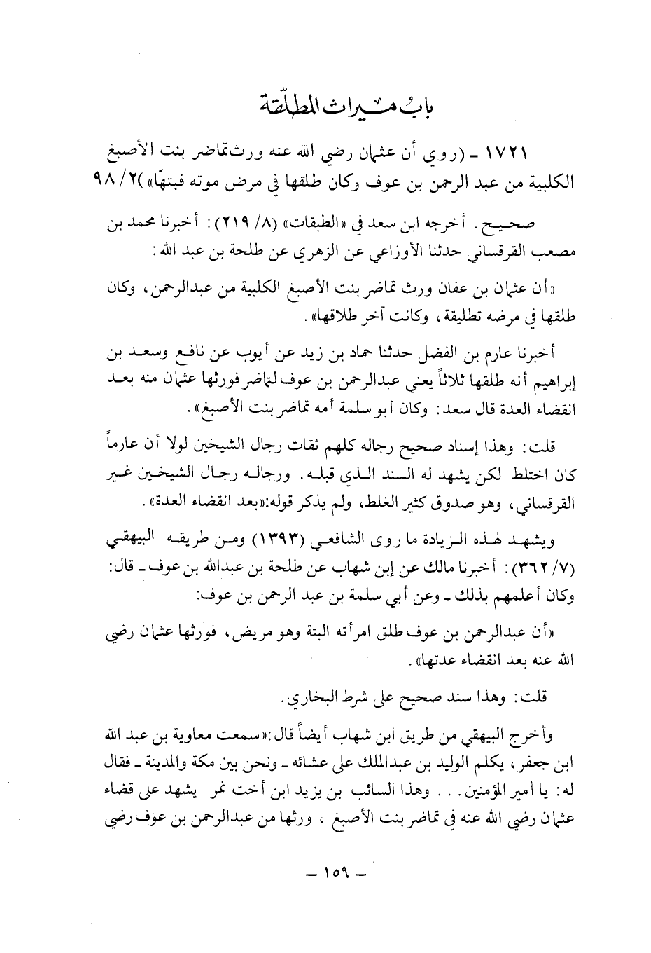 (1721) - (روى: " أن عثمان رضى الله عنه ورث تماضر بنت الأصبغ الكلبية من عبد الرحمن بن عوف وكان طلقها فى مرض موته فبتها " (2/98) .