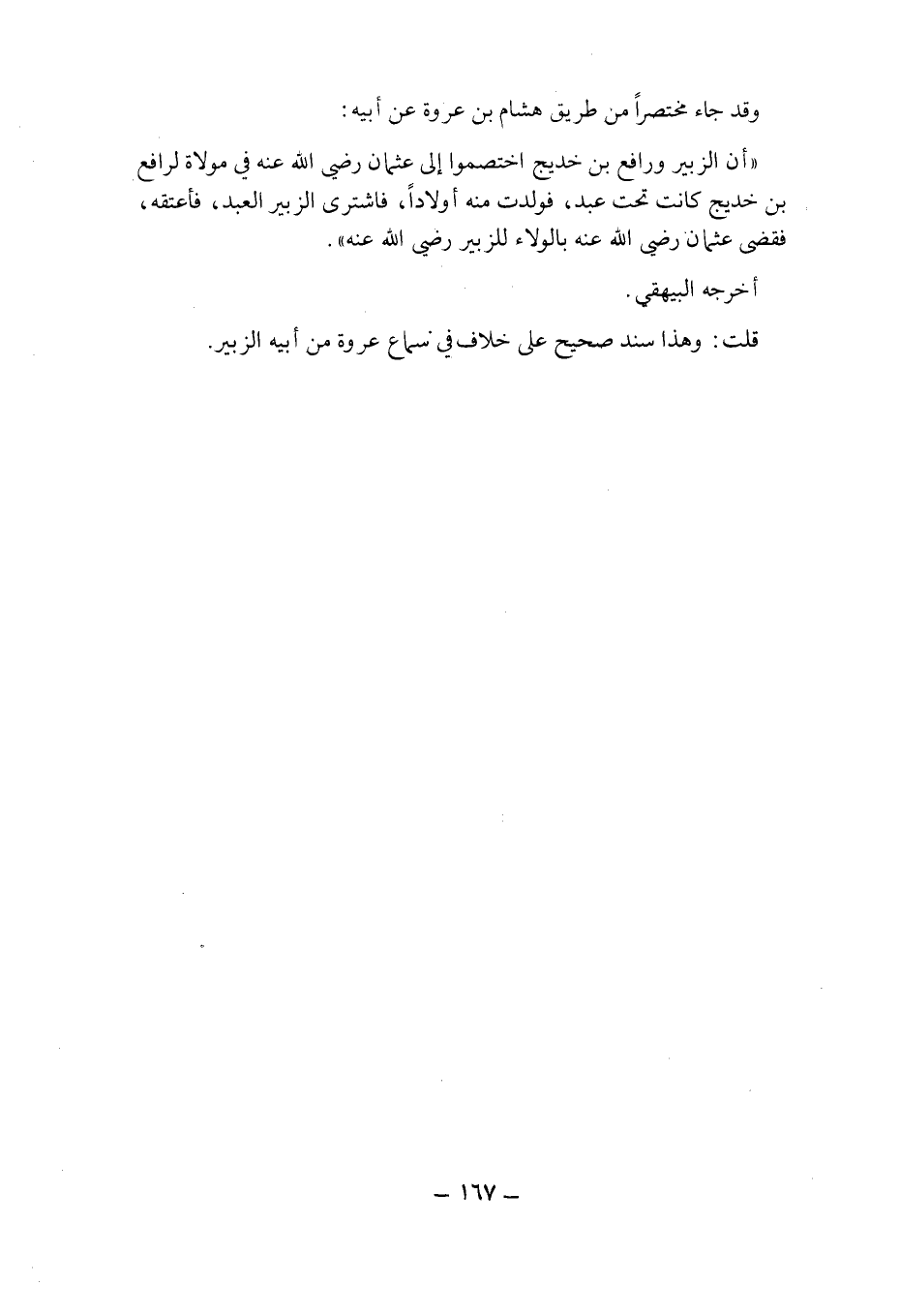 وقد جاء مختصرا من طريق هشام بن عروة عن أبيه: " أن الزبير ورافع بن خديج اختصموا إلى عثمان رضى الله عنه فى مولاة لرافع بن خديج كانت تحت عبد , فولدت منه أولادا , فاشترى الزبير العبد , فأعتقه , فقضى عثمان رضى الله عنه بالولاء للزبير رضى الله عنه " أخرجه البيهقى.