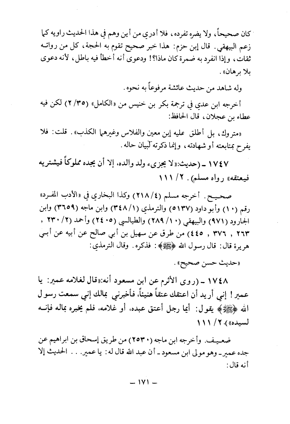 (1747) - (حديث: " لا (يجزىء) [1] ولد والده , إلا أن يجده مملوكا فيشتريه فيعتقه " رواه مسلم (2/111) .