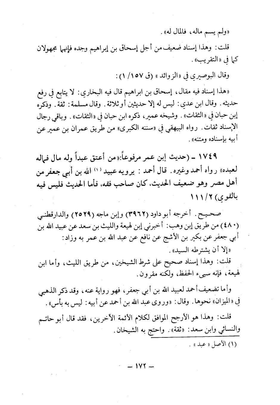 (1749) - (حديث ابن عمر مرفوعا: " من أعتق عبدا وله مال فماله لعبده " رواه أحمد وغيره. قال أحمد: يرويه عبيد الله (1) بن أبى جعفر من أهل مصر وهو ضعيف الحديث , كان صاحب فقه , فأما الحديث فليس فيه بالقوى (2/111) .