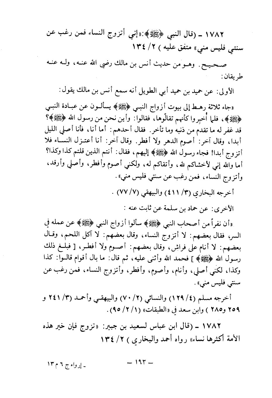 (1782) - (قال النبى صلى الله عليه وسلم: " إنى أتزوج النساء فمن رغب عن سنتى فليس منى " متفق عليه (2/134) .