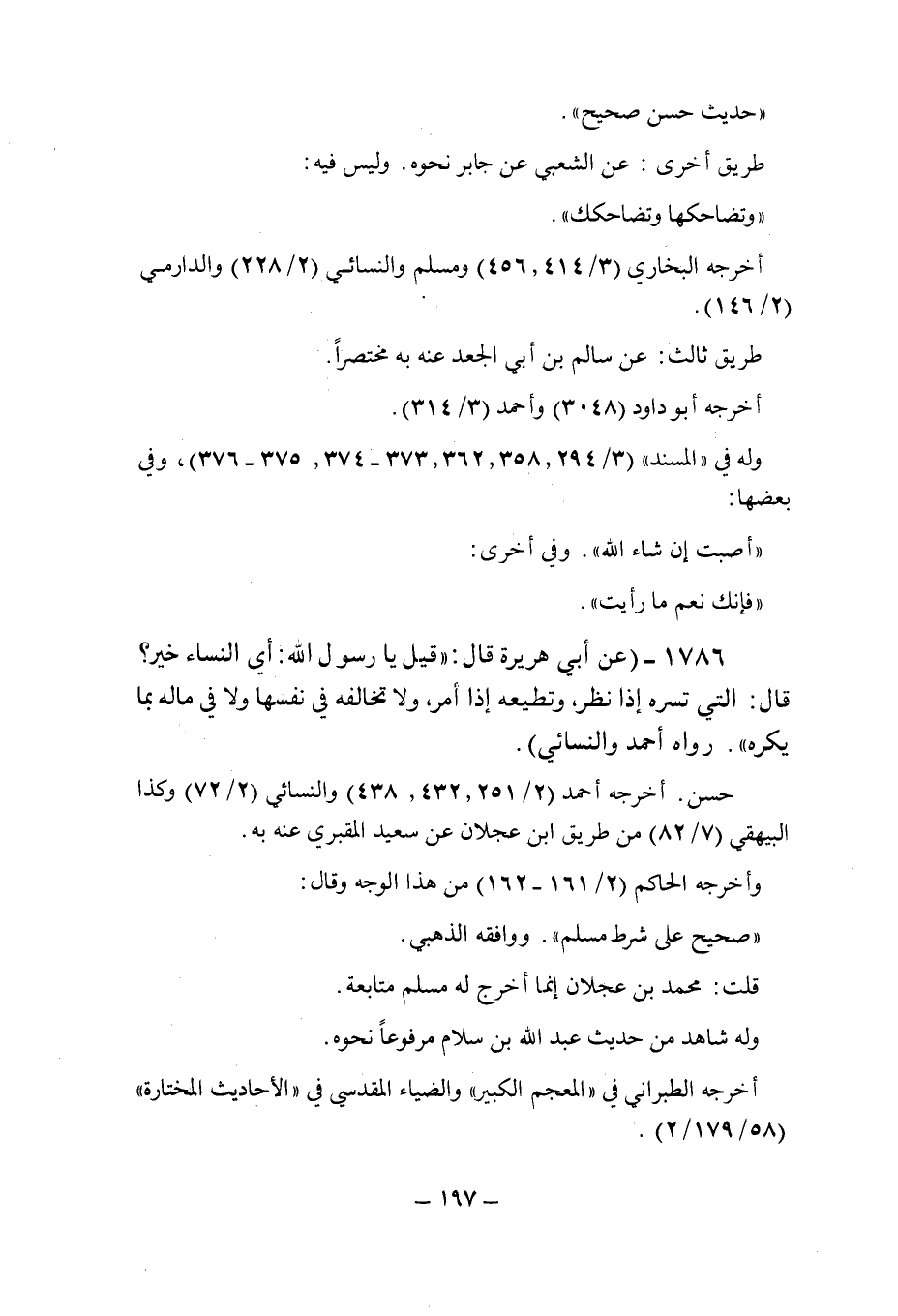 (1786) - (عن أبى هريرة قال: " قيل يا رسول الله: أى النساء خير؟ قال: التى تسره إذا نظر , وتطيعه إذا أمر , ولاتخالفه فى نفسها ولا فى ماله بما يكره " رواه أحمد والنسائى.
