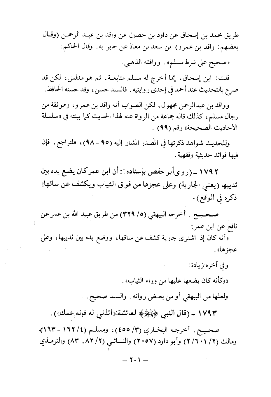 (1792) - (روى أبو حفص بإسناده: " أن ابن عمر كان يضع يده بين ثدييها (يعنى الجارية) وعلى عجزها من فوق الثياب ويكشف عن ساقها " ذكره فى (فى الوقع) [1] .