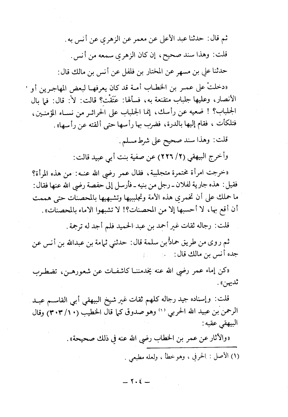 وأخرج البيهقى (2/226) عن صفية بنت أبى عبيد قالت: " خرجت امرأة مختمرة متجلببة , فقال عمر رضى الله عنه: من هذه المرأة؟ فقيل: هذه جارية لفلان ـ رجل من بنيه ـ فأرسل إلى حفصة رضى الله عنها فقال: ما حملك على أن تخمرى هذه الأمة وتجلببيها وتشبهيها بالمحصنات حتى هممت أن أقع بها , لا أحسبها إلا من المحصنات؟! لا تشبهوا الإماء بالمحصنات ".