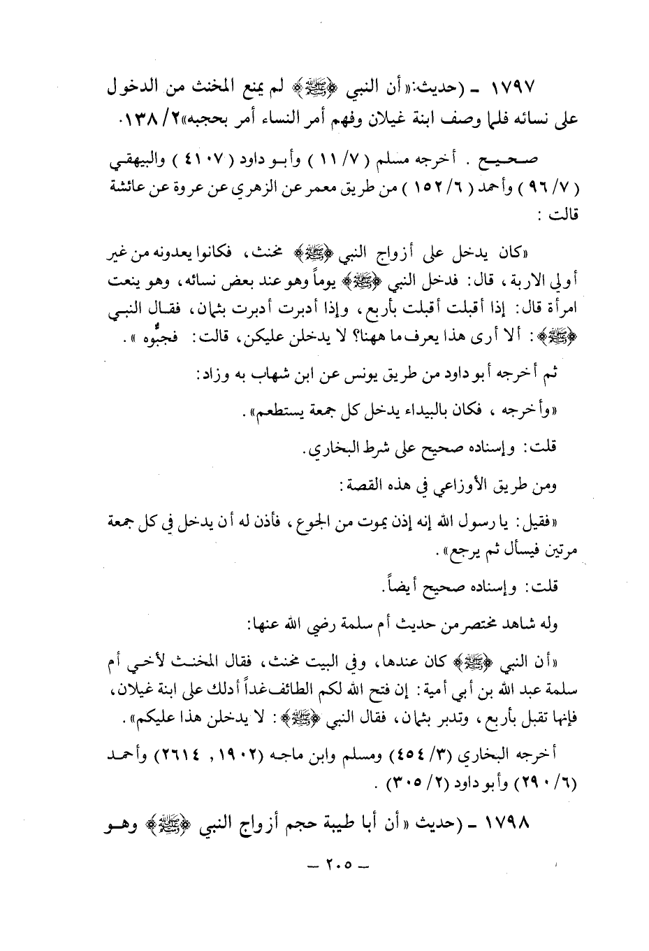 (1797) - (حديث: " أن النبى صلى الله عليه وسلم لم يمنع المخنث من الدخول على نسائه فلما وصف ابنة غيلان وفهم أمر النساء أمر بحجبه " (2/138) .
