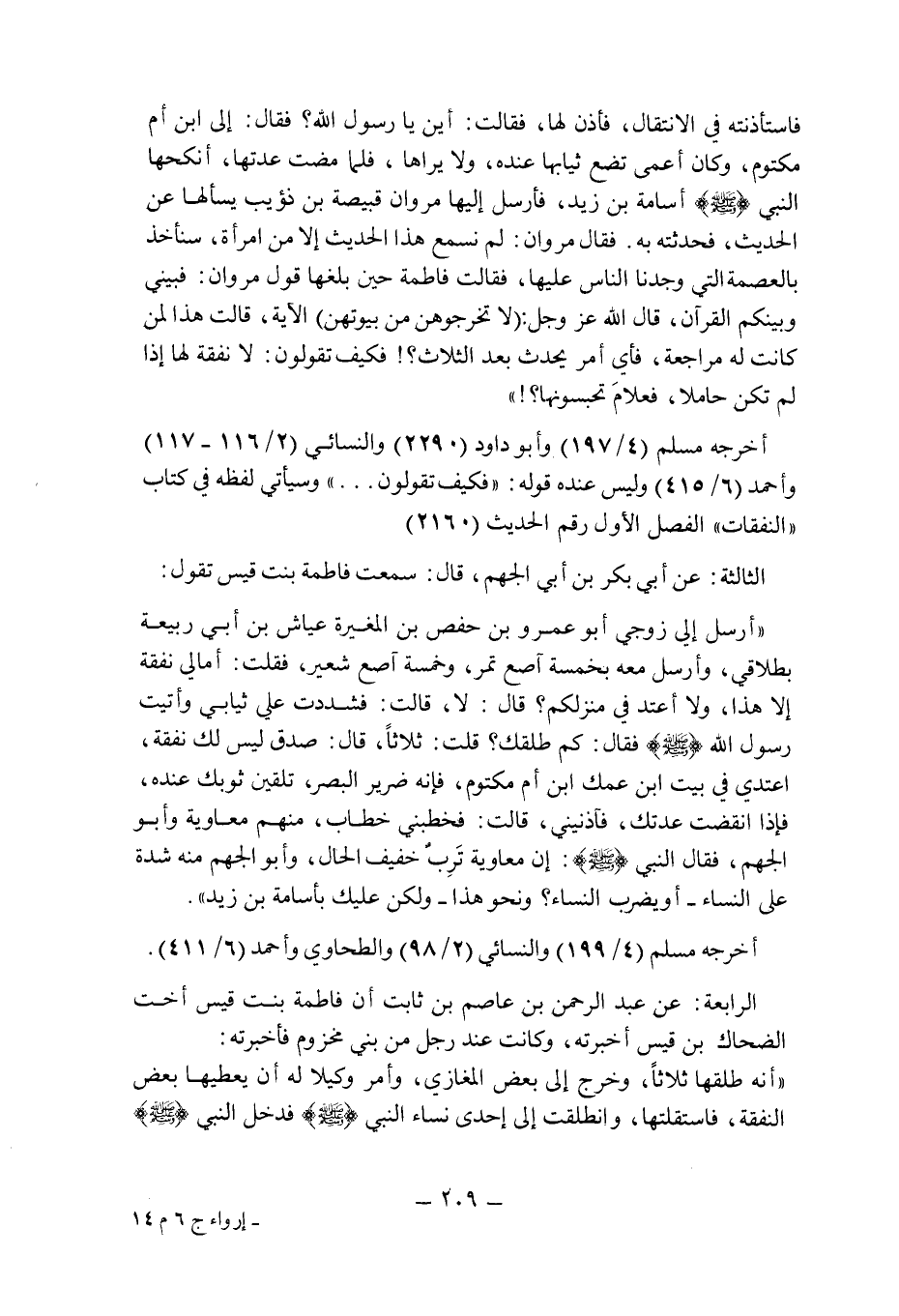 فاستأذنته فى الانتقال , فأذن لها , فقالت: أين يا رسول الله؟ إلى ابن أم مكتوم , وكان أعمى تضع ثيابها عنده , ولا يراها , فلما مضت عدتها , أنكحها النبى صلى الله عليه وسلم أسامة بن زيد , فأرسل إليها مروان بن قبيصة بن ذؤيب يسألها عن الحديث , فحدثته به , فقال مروان: لم نسمع هذا الحديث إلا من امرأة , سنأخذ بالعصمة التى وجدنا الناس عليها , فقالت فاطمة حين بلغها قول مروان: فبينى وبينكم القرآن , قال الله عز وجل: (لا تخرجوهن من بيوتهن) الآية , قالت: هذا لمن كانت له مراجعة , فأى أمر يحدث بعد الثلاث؟! فكيف تقولون: لا نفقة لها إذا لم تكن حاملا , فعلام تحبسونها؟! ".