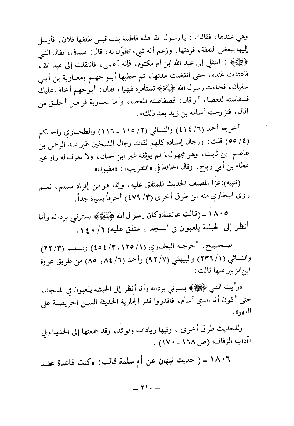 (1805) - (قالت عائشة: " كان رسول الله صلى الله عليه وسلم يسترنى بردائه وأنا أنظر إلى الحبشة يلعبون فى المسجد " متفق عليه (2/140) .