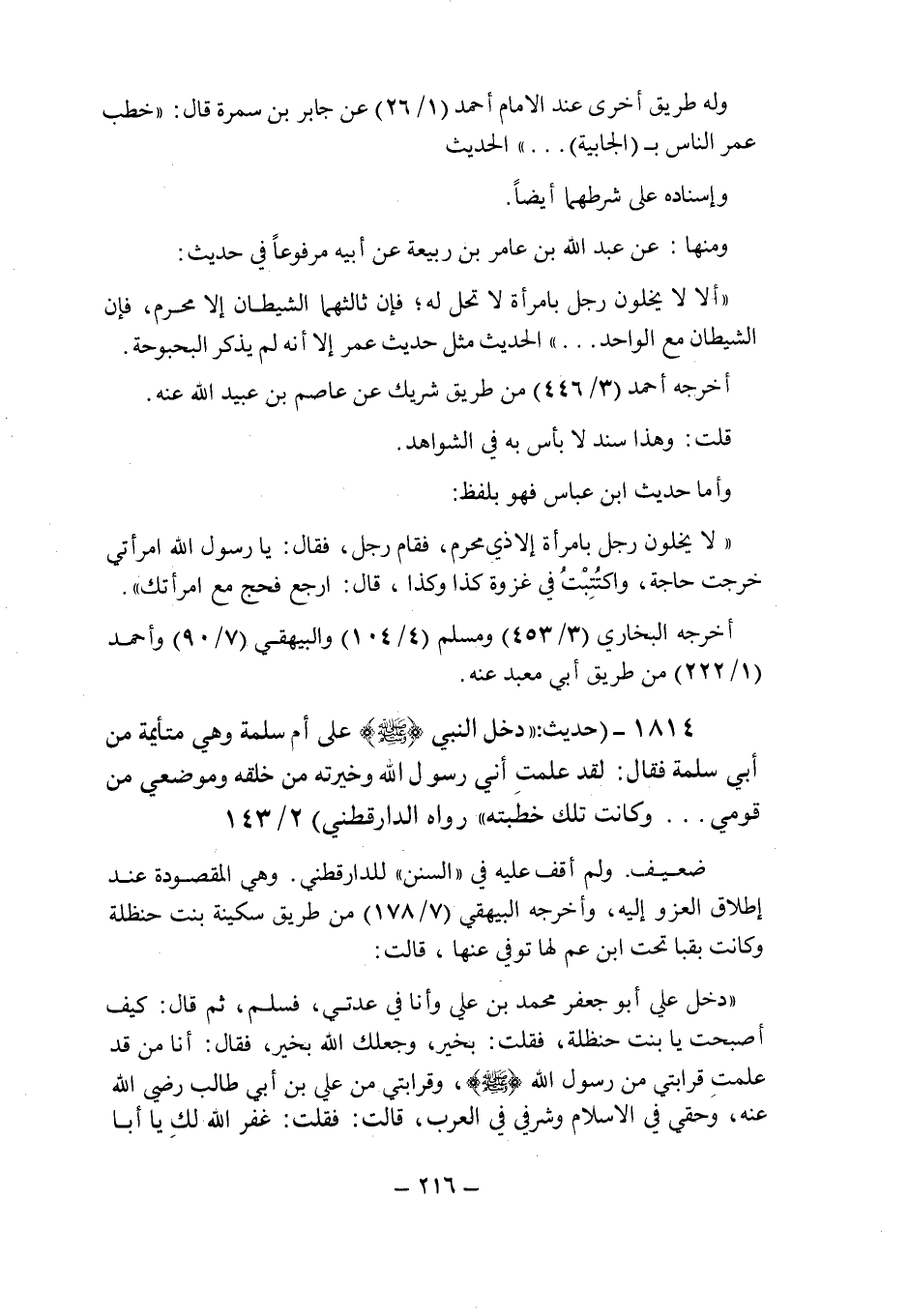 (1814) - (حديث: " دخل النبى صلى الله عليه وسلم على أم سلمة وهى متأيمة من أبى سلمة فقال: لقد علمت أنى رسول الله وخيرته من خلقه وموضعى من قومى ... وكانت تلك خطبته " رواه الدارقطنى (2/143) .