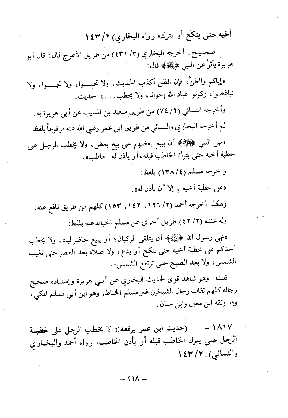 (1817) - (حديث ابن عمر يرفعه: " لا يخطب الرجل على خطبة الرجل حتى يترك الخاطب قبله أو يأذن الخاطب " رواه أحمد والبخارى والنسائى (2/143) .