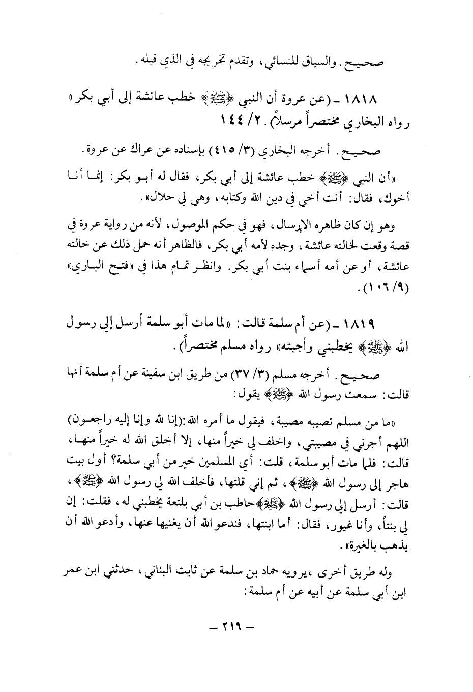 (1818) - (عن عروة: " أن النبى صلى الله عليه وسلم خطب عائشة إلى أبى بكر " رواه البخارى مختصرا مرسلا (2/144) .
