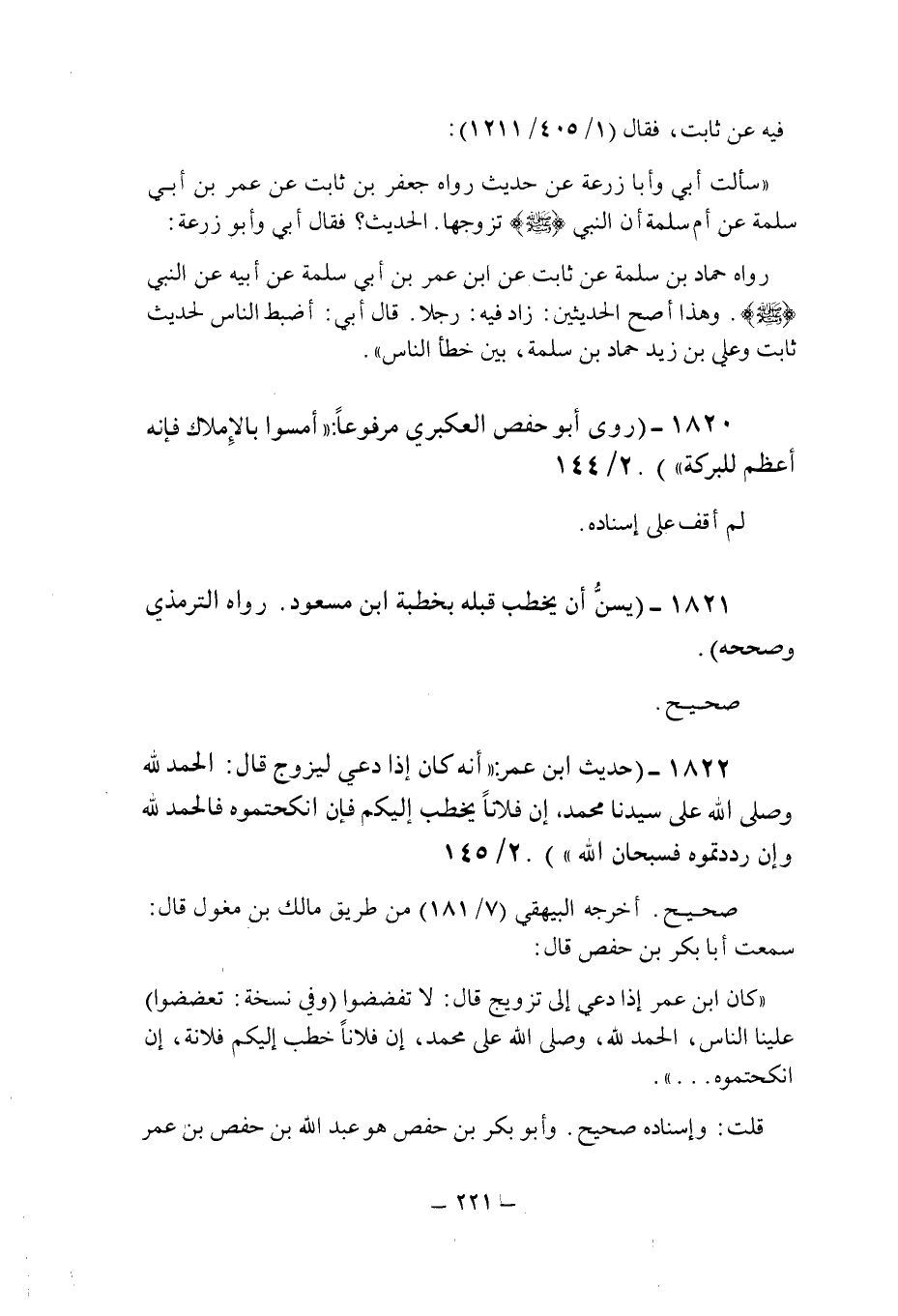 (1822) - (حديث ابن عمر: " أنه كان إذا دعى ليزوج قال: الحمد لله وصلى الله على سيدنا محمد , إن فلانا يخطب إليكم فإن أنكحتموه فالحمد لله وإن رددتموه فسبحان الله " (2/145) .