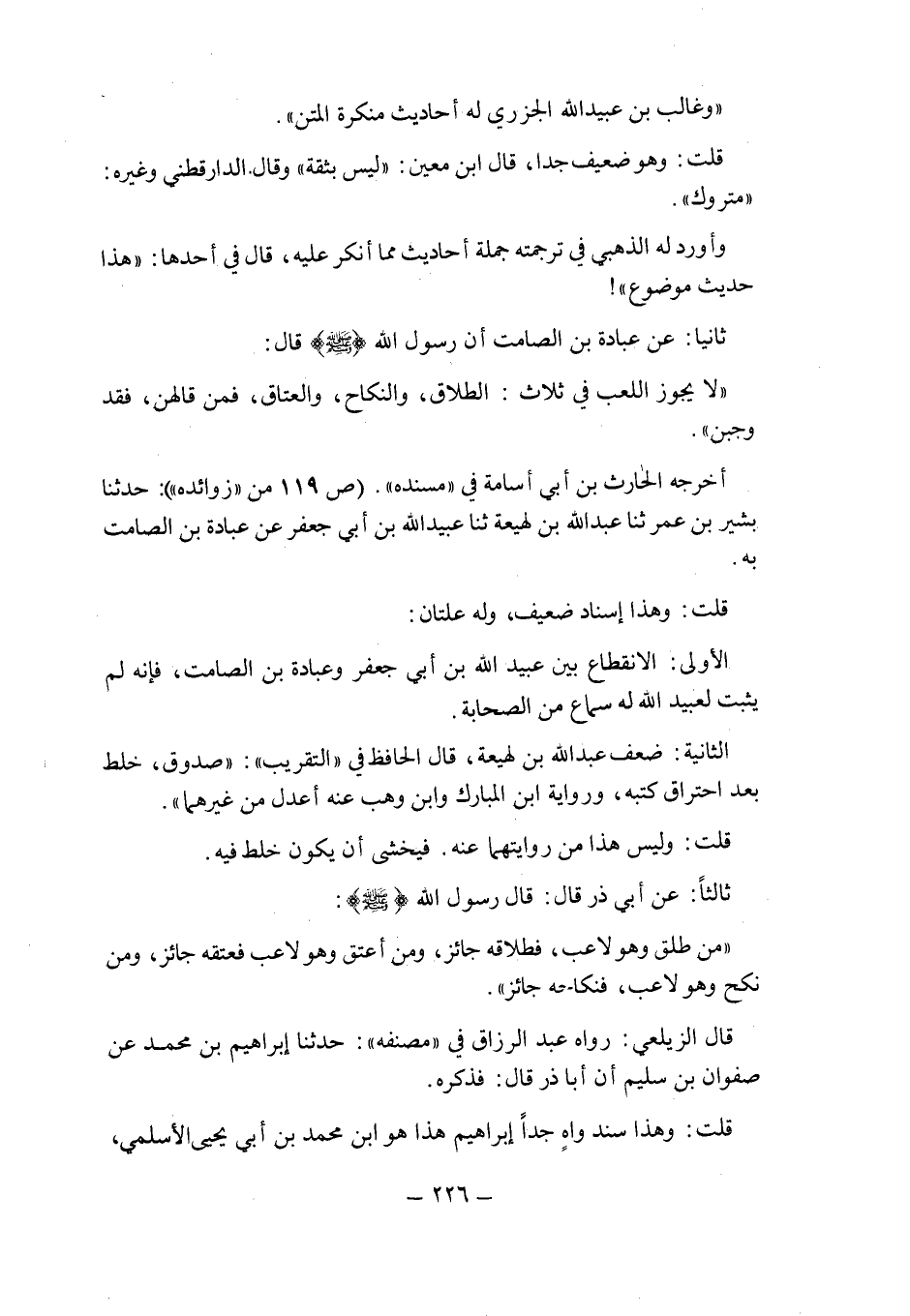 ثانيا: عن عبادة بن الصامت أن رسول الله صلى الله عليه وسلم قال: " لا يجوز اللعب فى ثلاث: الطلاق , والنكاح , والعتاق , فمن قالهن , فقد وجبن " أخرجه الحارث بن أبى أسامة فى " مسنده " (ص 119 من " زوائده ") : حدثنا بشير بن عمر حدثنا عبد الله بن لهيعة حدثنا عبيد الله بن أبى جعفر عن عبادة بن الصامت به.