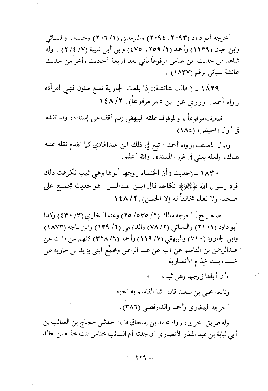 (1830) - (حديث: " أن الخنساء زوجها أبوها وهى ثيب فكرهت ذلك فرد رسول الله صلى الله عليه وسلم نكاحه قال ابن عبد البر: هو حديث مجمع على صحته ولا نعلم مخالفا له إلا الحسن (2/148) .