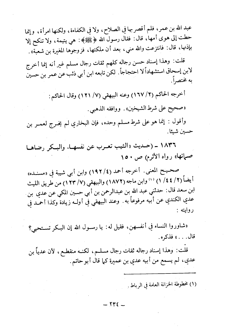 (1836) - (حديث: " الثيب تعرب عن نفسها , والبكر رضاها صماتها " رواه الأثرم (ص 150)