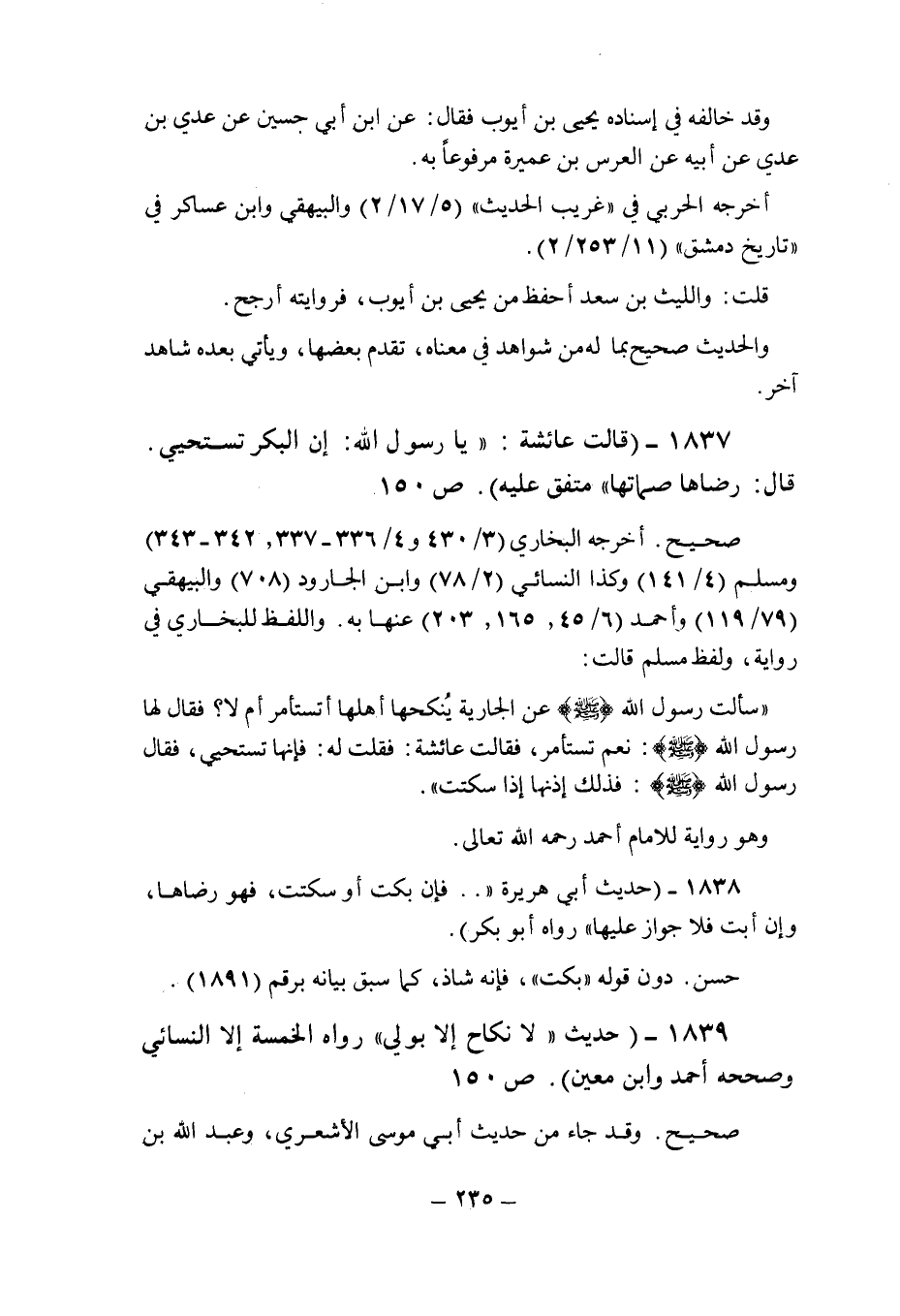 (1837) - (قالت عائشة: " يا رسول الله: إن البكر تستحيى. قال: رضاها صماتها " متفق عليه (ص 150) .
