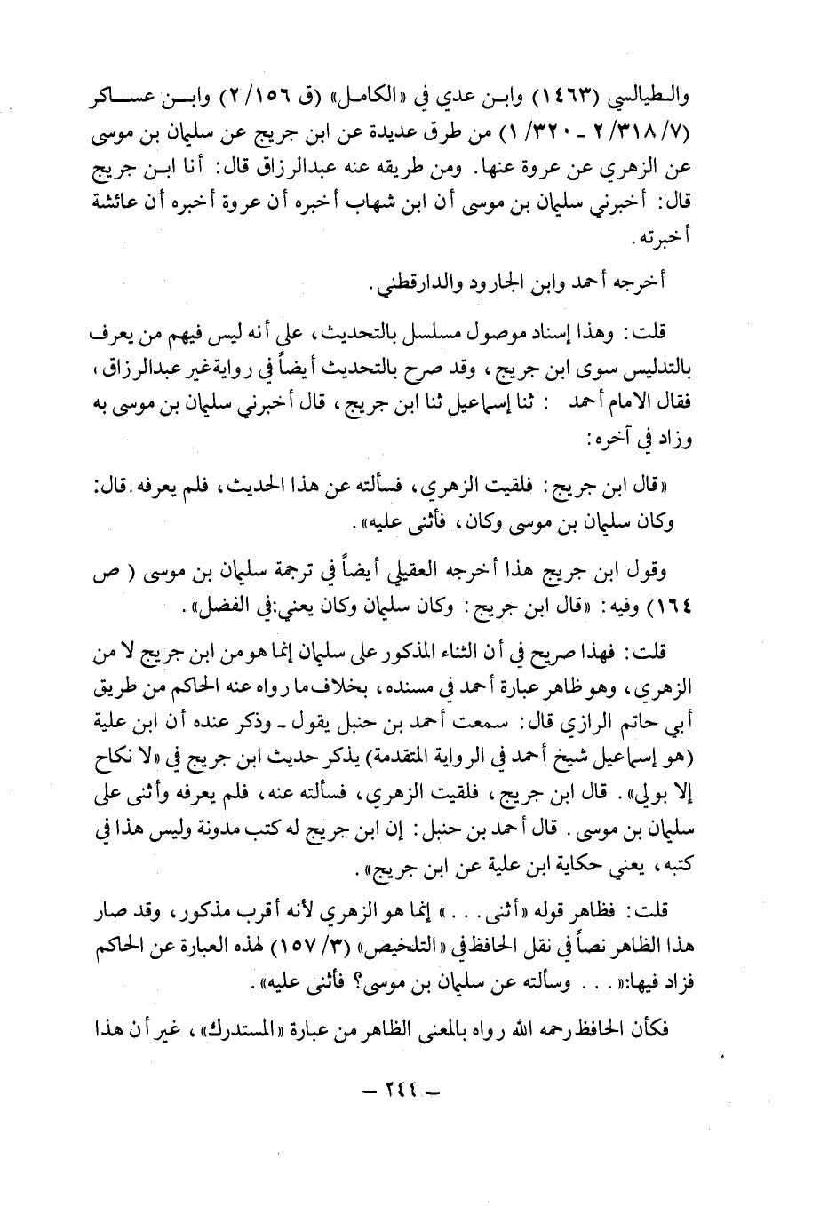 قلت: فهذا صريح فى أن الثناء على سليمان إنما هو من ابن جريج لا من الزهرى , وهو ظاهر عبارة أحمد فى مسنده , بخلاف ما رواه عنه الحاكم من طريق أبى حاتم الرازى قال: سمعت أحمد بن حنبل يقول ـ وذكر عنده أن ابن علية (هو إسماعيل شيخ أحمد فى الرواية المتقدمة) يذكر حديث ابن جريج فى " لا نكاح إلا بولى " , قال ابن جريج , فلقيت الزهرى , فسألته عنه , فلم يعرفه وأثنى على سليمان بن موسى , قال أحمد بن حنبل: إن ابن جريج له كتب مدونة وليس هذا فى كتبه , يعنى حكاية ابن علية عن ابن جريج ".