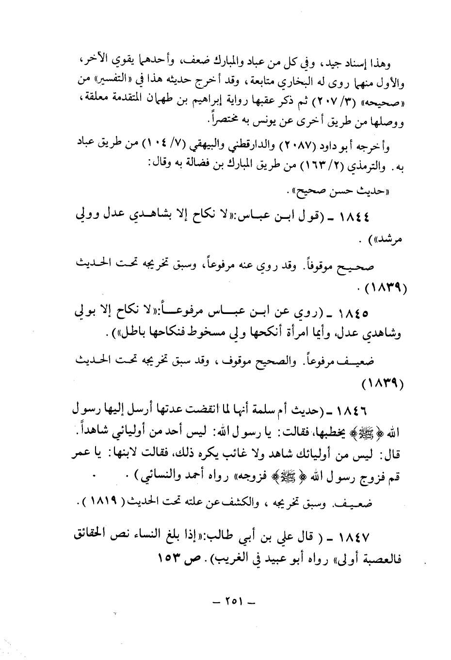 (1845) - (روى عن ابن عباس مرفوعا: " لا نكاح إلا بولى وشاهدى عدل , وأيما امرأة أنكحها ولى مسخوط فنكاحها باطل ".