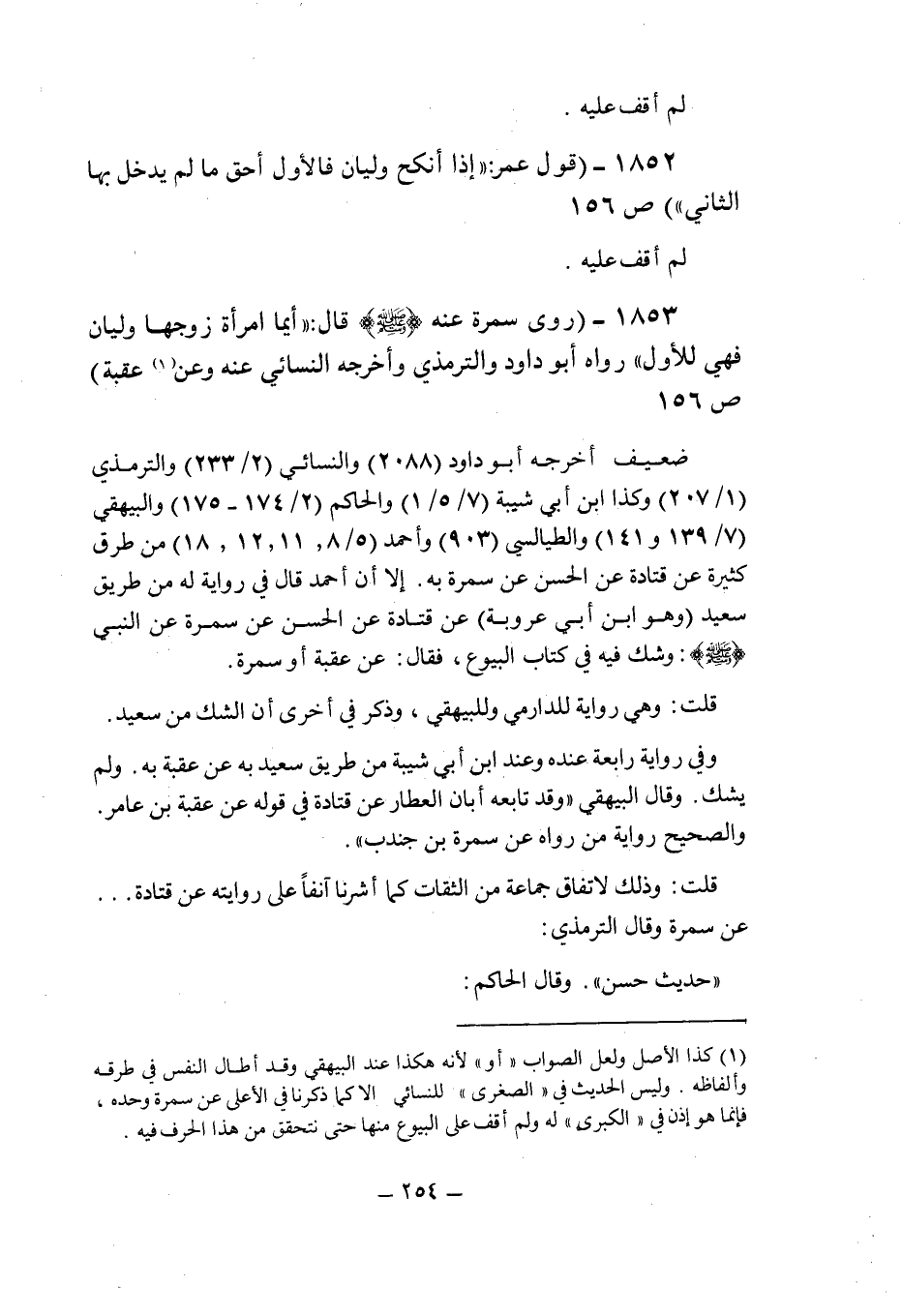 (1853) - (روى سمرة عنه صلى الله عليه وسلم قال: " أيما امرأة زوجها وليان فهى للأول " رواه أبو داود والترمذى وأخرجه النسائى عنه و (1) عن عقبة (ص 156) .