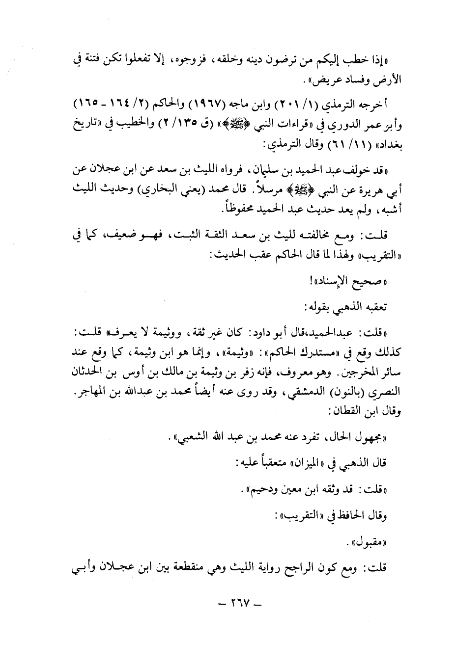 قلت: ومع مخالفته لليث بن سعد الثقة الثبت , فهو ضعيف , كما فى " التقريب " ولهذا لما قال الحاكم عقب الحديث: " صحيح الإسناد ".!