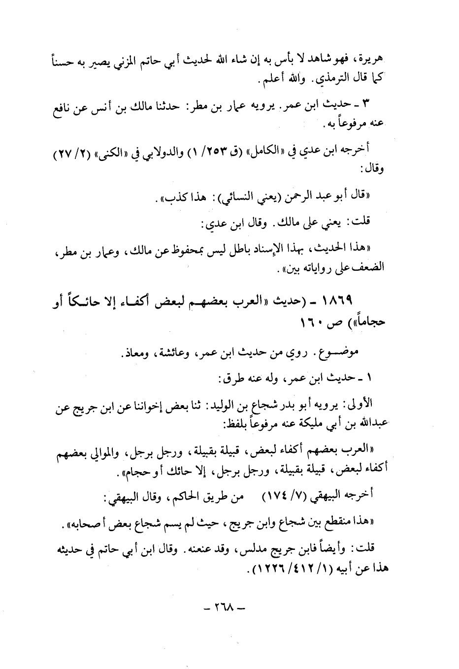 (1869) - (حديث: " العرب بعضهم لبعض أكفاء إلا حائكا أو حجاما " (ص 160) .