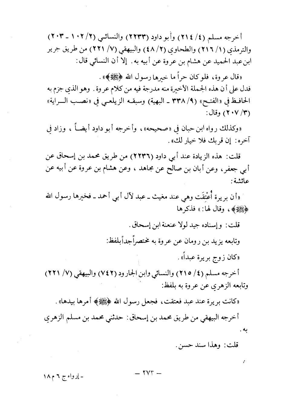 فدل على أن هذه الجملة الأخيرة منه مدرجة فيه من كلام عروة , وهو الذى جزم به الحافظ فى " الفتح " (9/338 ـ البهية) وسبقه الزيلعى فى " نصب الراية " (3/207) وقال: " وكذلك رواه ابن حبان فى " صحيحه " , وأخرجه أبو داود أيضا , وزاد فى آخره: إن قربك فلا خيار لك ".