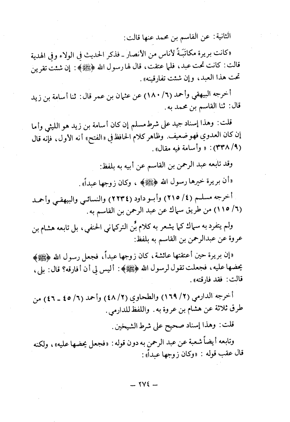 ولم يتفرد به سماك كما يشعر به كلام بن التركمانى الحنفى , بل تابعه هشام بن عروة عن عبد الرحمن بن القاسم به بلفظ: " إن بريرة حين أعتقتها عائشة , كان زوجها عبدا , فجعل رسول الله صلى الله عليه وسلم يحضها عليه , فجعلت تقول لرسول الله صلى الله عليه وسلم: أليس لى أن أفارقه؟ قال: بلى , قالت: فقد فارقته ".
