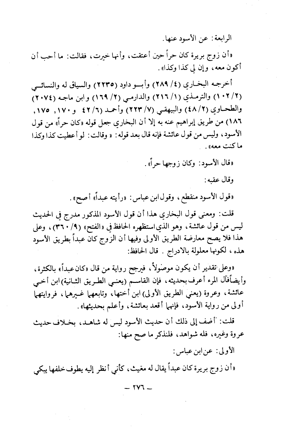 قلت: ومعنى قول البخارى هذا أن قول الأسود المذكور مدرج فى الحديث ليس من قول عائشة , وهو الذى استظهره الحافظ فى " الفتح " (9/360) , وعلى هذا فلا يصح معارضة الطريق الأولى وفيها أن الزوج كان عبدا بطريق الأسود هذه , لكونها معلولة بالإدراج.