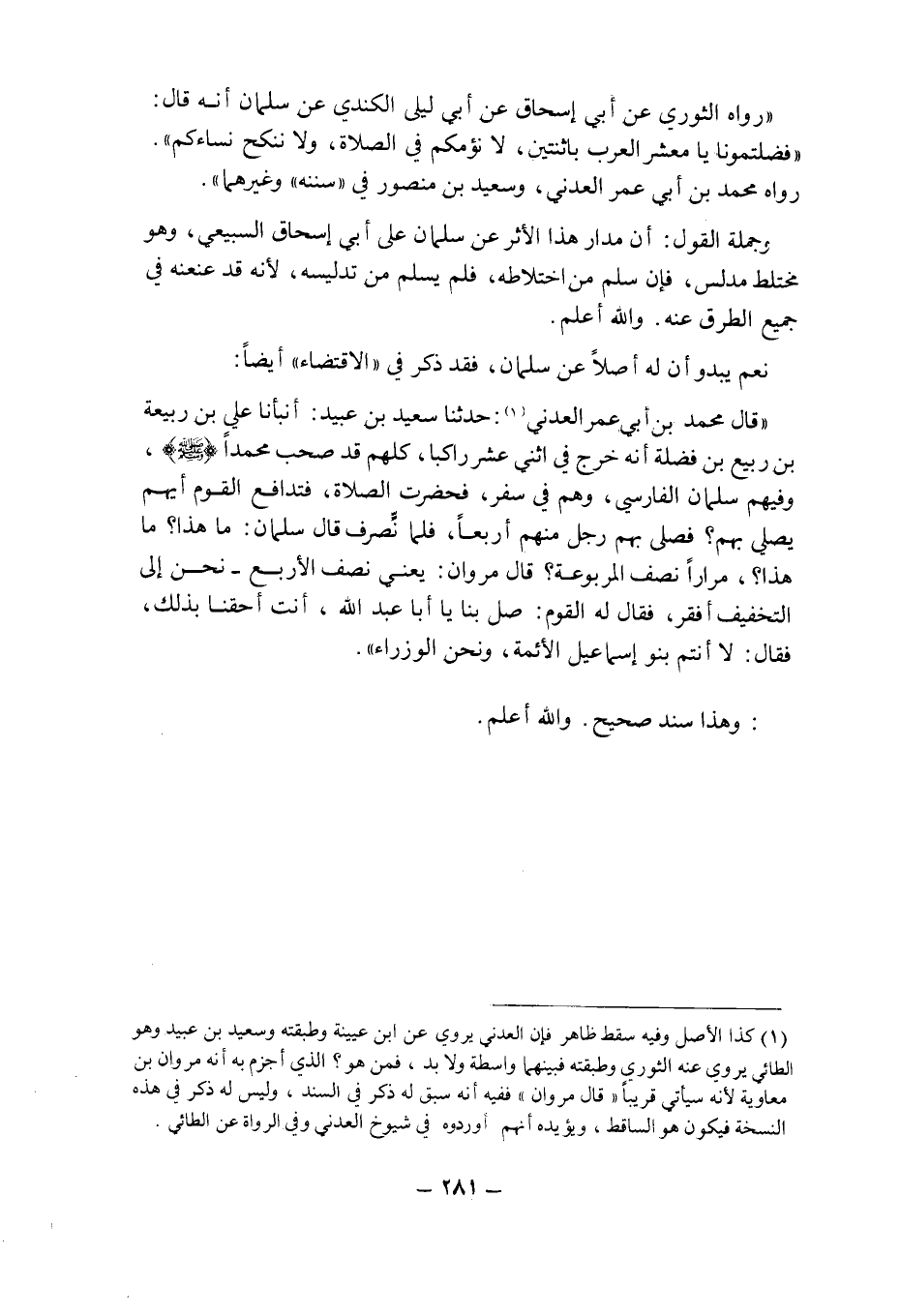 نعم يبدو أن له أصلا عن سلمان , فقد ذكر فى " الاقتضاء " أيضا: " قال محمد بن أبى عمر العدنى <2>: حدثنا سعيد بن عبيد: أنبأنا على بن ربيعة بن ربيع بن فضلة أنه خرج فى اثنى عشر راكبا وكلهم قد صحب محمدا صلى الله عليه وسلم , وفيهم سلمان الفارسى , وهم فى سفر , فحضرت الصلاة , فتدافع القوم أيهم يصلى بهم؟ فصلى بهم رجل منهم أربعا , فلما انصرف قال سلمان: ما هذا؟ ما هذا؟ مرارا نصف المربوعة؟ قال مروان: يعنى نصف الأربع ـ نحن إلى التخفيف أفقر , فقال له القوم: صلى بنا يا أبا عبد الله , أنت أحقنا بذلك , فقال: لا أنتم بنو إسماعيل الأئمة , ونحن الوزراء ".