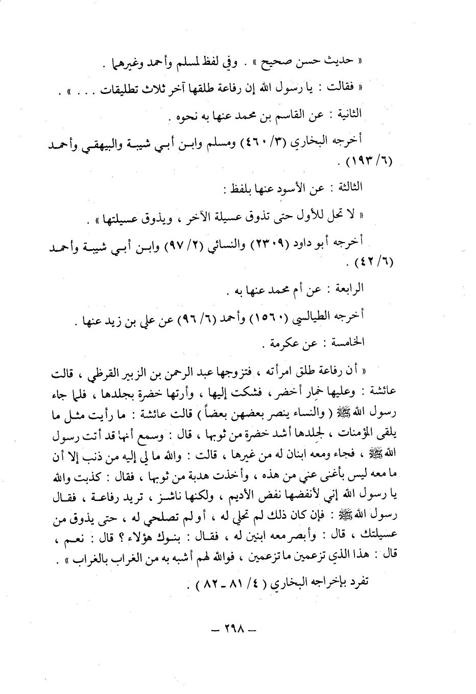 " أن رفاعة طلق امرأته , فتزوجها عبد الرحمن بن الزبير القرظى , قالت عائشة: وعليها خمار أخضر , فشكت إليها , وأرتها خضرة بجلدها , فلما جاء رسول الله صلى الله عليه وسلم (والنساء ينصر بعضهن بعضا) قالت عائشة: ما رأيت مثل ما يلقى المؤمنات , لجلدها أشد خضرة من ثوبها , قال: وسمع أنها قد أتت رسول الله صلى الله عليه وسلم , فجاء ومعه ابنان له من غيرها , قالت: والله ما لى إليه من ذنب إلا أن ما معه ليس بأغنى عنى من هذه , وأخذت هدبة من ثوبها , فقال: كذبت والله يا رسول الله إنى لأنفضها نفض الأديم , ولكنها ناشز , تريد رفاعة , فقال رسول الله صلى الله عليه وسلم: فإن كان ذلك لم تحلى له , أو لم تصلحى له , حتى يذوق من عسيلتك , قال: وأبصر معه ابنين له , فقال: بنوك هؤلاء؟ قال: نعم , قال: هذا الذى تزعمين ما تزعمين , فوالله لهم أشبه به من الغراب بالغراب " تفرد بإخراجه البخارى (4/81 ـ 82) .