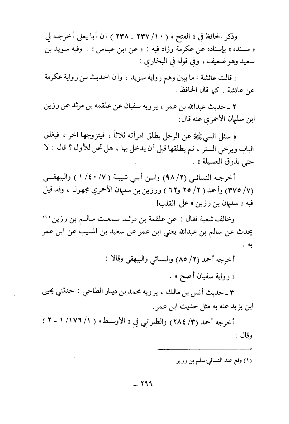 2 ـ حديث عبد الله بن عمر , يرويه سفيان عن علقمة بن مرثد عن رزين بن سليمان الأحمرى عنه قال: " سئل النبى صلى الله عليه وسلم عن الرجل يطلق امرأته ثلاثا , فيتزوجها آخر , فيغلق الباب ويرخى الستر , ثم يطلقها قبل أن يدخل بها , هل تحل للأول؟ قال: لا حتى يذوق العسيلة ".