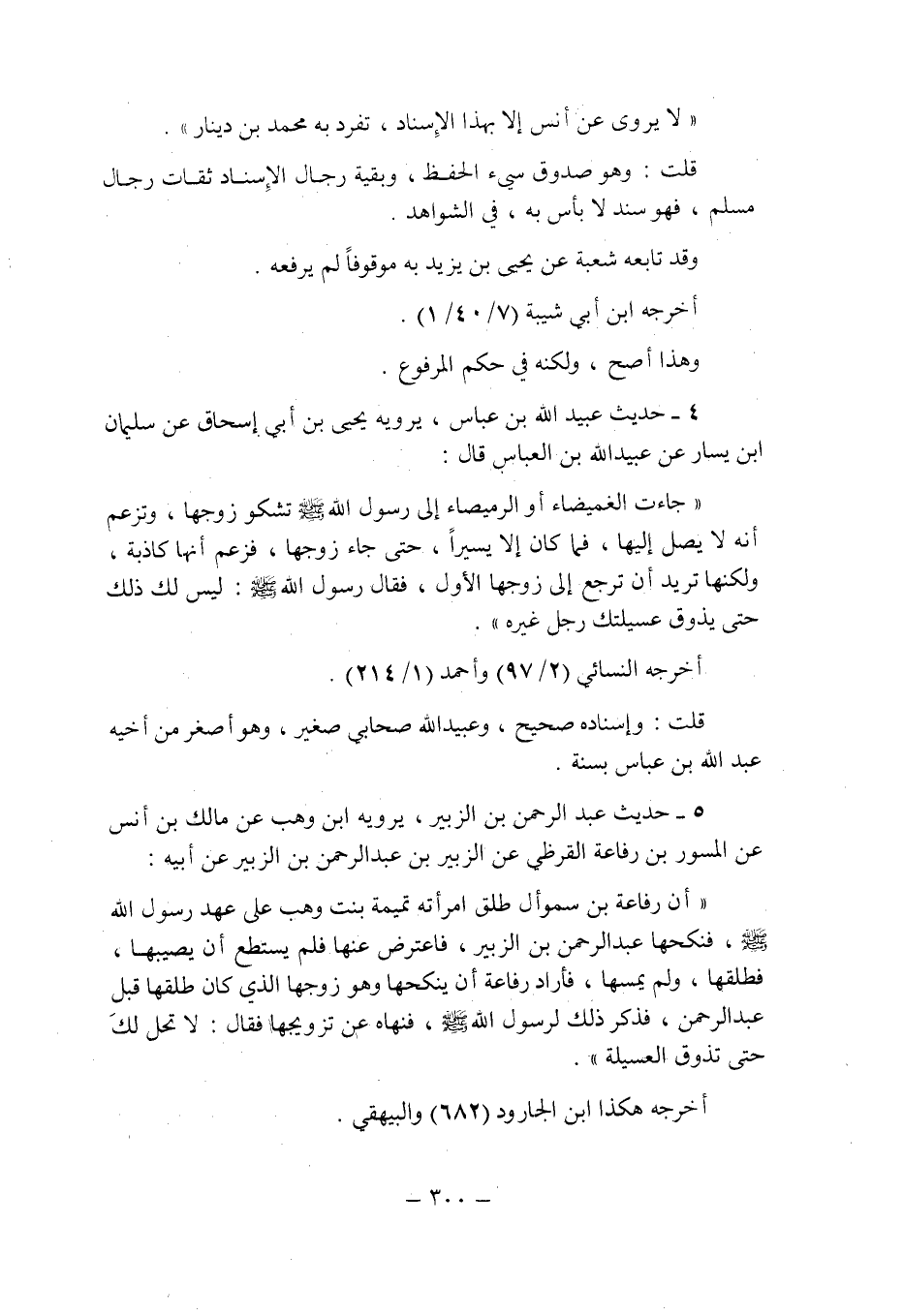 4 ـ حديث عبيد الله بن عباس , يرويه يحيى بن أبى إسحاق عن سليمان بن يسار عن عبيد الله بن العباس قال: " جاءت الغميضاء أو الرميصاء إلى رسول الله صلى الله عليه وسلم تشكو زوجها , وتزعم أنه لا يصل إليها , فما كان إلا يسيرا , حتى جاء زوجها , فزعم أنها كاذبة , ولكنها تريد أن ترجع إلى زوجها الأول , فقال رسول الله صلى الله عليه وسلم: ليس لك ذلك حتى يذوق عسيلتك رجل غيره ".