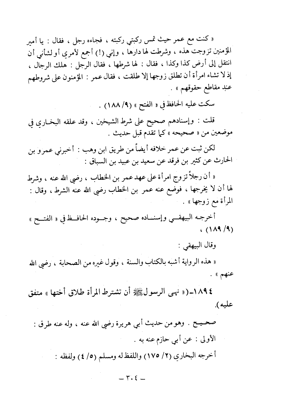 " كنت مع عمر حيث تمس ركبتى ركبته , فجاءه رجل , فقال: يا أمير المؤمنين تزوجت هذه , وشرطت لها دارها , وإنى (!) أجمع لأمرى أو لشأنى أن انتقل إلى أرض كذا وكذا , فقال: لها شرطها , فقال الرجل: هلك الرجال , إذ لا تشاء امرأة أن تطلق زوجها إلا طلقت , فقال عمر: المؤمنون على شروطهم عند مقاطع حقوقهم ".