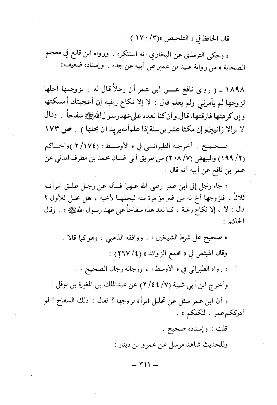 (1898) - (روى نافع عن ابن عمر أن رجلا قال له: " تزوجتها أحلها لزوجها لم يأمرنى ولم يعلم قال: لا إلا نكاح رغبة إن أعجبتك أمسكتها وإن كرهتها فارقتها , قال: وإن كنا نعده على عهد رسول الله صلى الله عليه وسلم سفاحا. وقال لا يزالا زانيين وإن مكثا عشرين سنة إذا علم أنه يريد أن يحلها (ص 173) .
