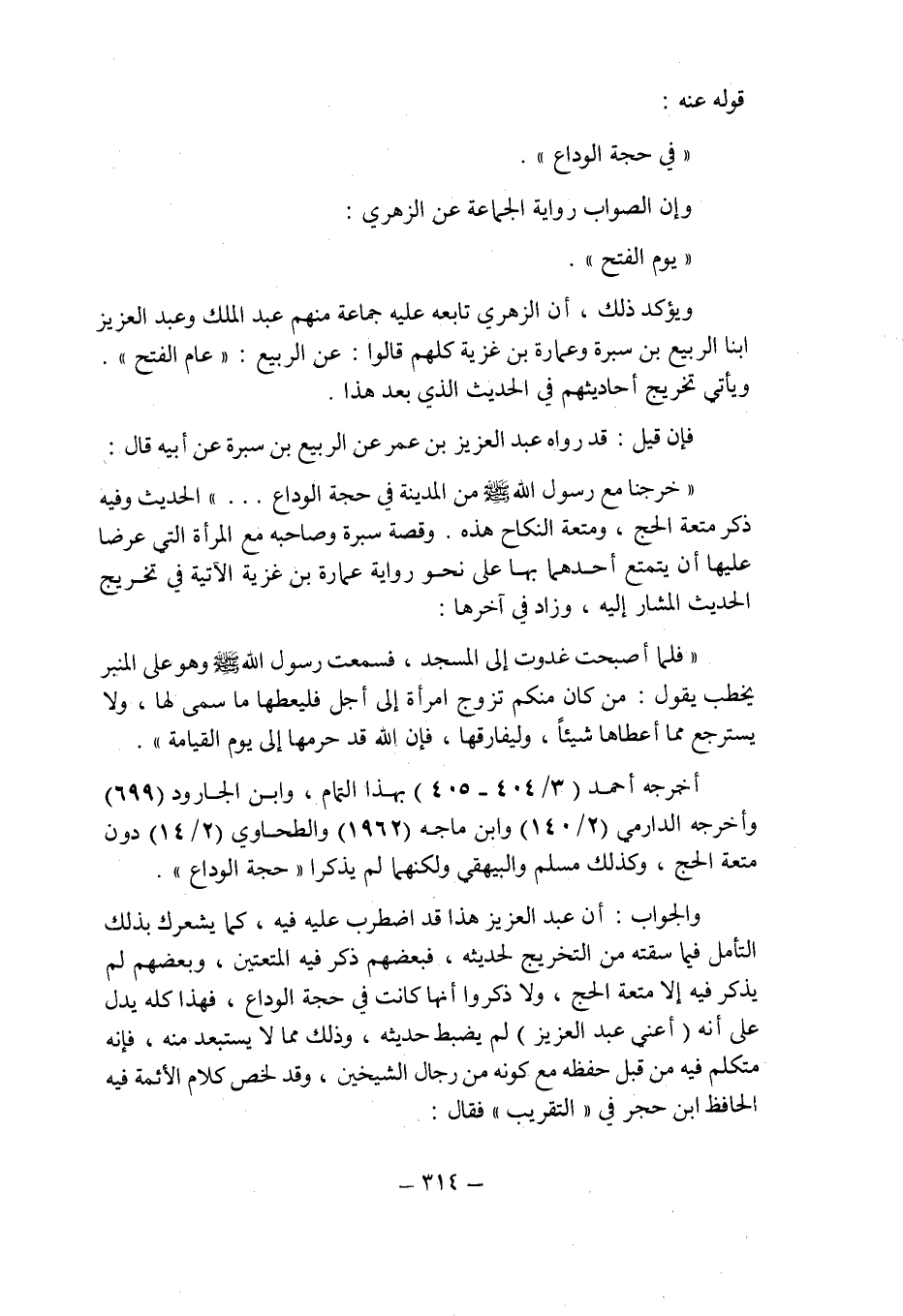 والجواب: أن عبد العزيز هذا قد اضطرب عليه فيه , كما يشعرك بذلك التأمل فيما سقته من التخريج لحديثه , فبعضهم ذكر فيه المتعتين , وبعضهم لم يذكر فيه إلا متعة الحج , ولا ذكروا أنها كانت فى حجة الوداع , فهذا كله يدل على أنه (أعنى عبد العزيز) لم يضبط حديثه , وذلك مما لا يستبعد منه , فإنه متكلم فيه من قبل حفظه مع كونه من رجال الشيخين , وقد لخص كلام الأئمة فيه الحافظ بن حجر فى " التقريب " فقال: