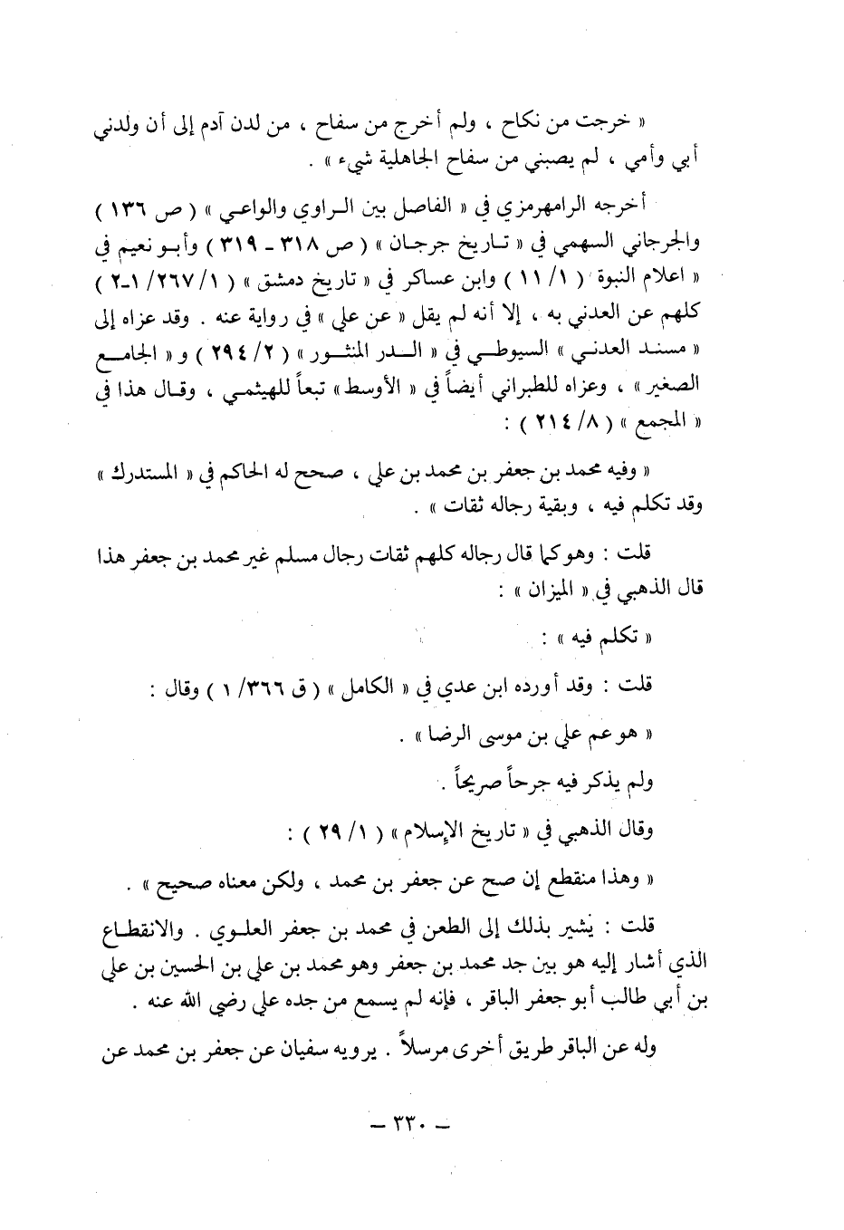 قلت: يشير بذلك إلى الطعن فى محمد بن جعفر العلوى , والانقطاع الذى أشار إليه هو بين جد محمد بن جعفر وهو محمد بن على بن الحسين بن على بن أبى طالب أبو جعفر الباقر , فإنه لم يسمع من جده على رضى الله عنه.