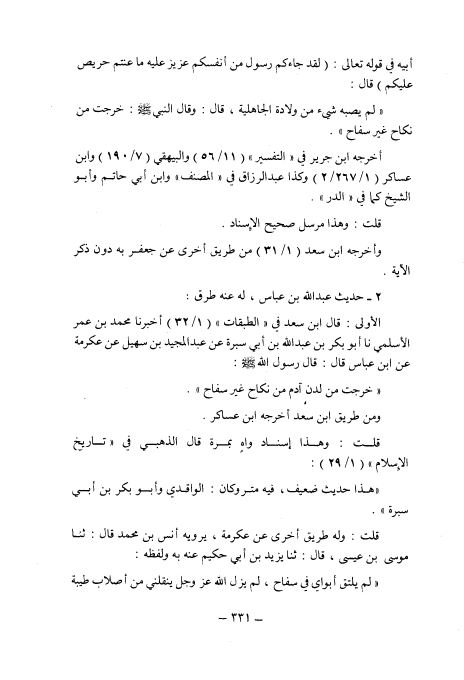 الأولى: قال ابن سعد فى " الطبقات " (1/32) أخبرنا محمد بن عمر الأسلمى أخبرنا أبو بكر بن عبد الله بن أبى سبرة عن عبد المجيد بن سهيل عن عكرمة عن ابن عباس قال: قال رسول الله صلى الله عليه وسلم: " خرجت من لدن آدم من نكاح غير سفاح ".