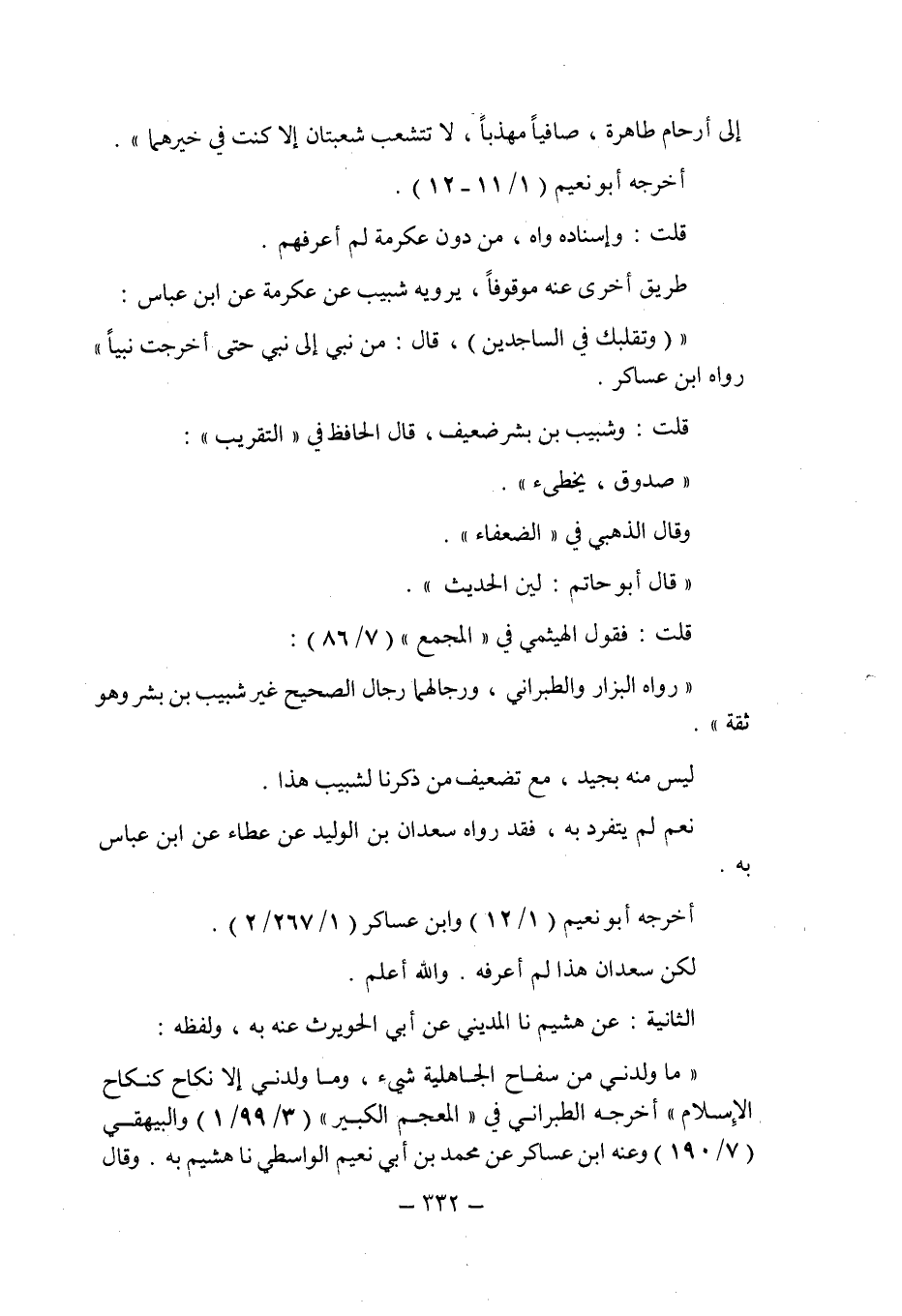 الثانية: عن هشيم أخبرنا المدينى عن أبى الحويرث عنه به , ولفظه: " ما ولدنى من سفاح الجاهلية شىء , وما ولدنى إلا نكاح كنكاح الإسلام " أخرجه الطبرانى فى " المعجم الكبير " (3/99/1) والبيهقى (7/190) وعنه ابن عساكر عن محمد بن أبى نعيم الواسطى أخبرنا هشيم به.