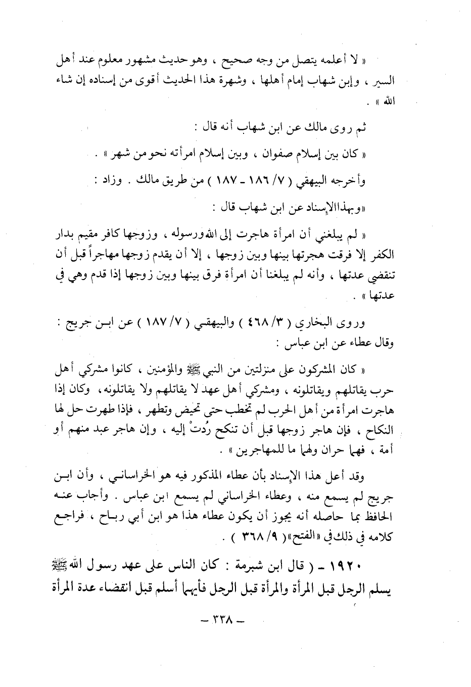 (1920) - (قال ابن شبرمة: " كان الناس على عهد رسول الله صلى الله عليه وسلم يسلم الرجل قبل المرأة والمرأة قبل الرجل فأيهما أسلم قبل انقضاء عدة المرأة