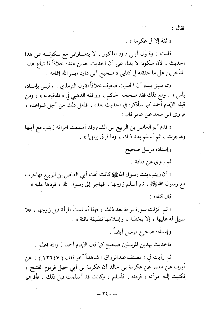 ثم رأيت فى " مصنف عبد الرزاق " شاهدا آخر فقال (12647) : عن أيوب عن معمر عن عكرمة بن خالد أن عكرمة بن أبى جهل فر يوم الفتح , فكتبت إليه امرأته , فردته , فأسلم , وكانت قد أسلمت قبل ذلك , فأقرهما