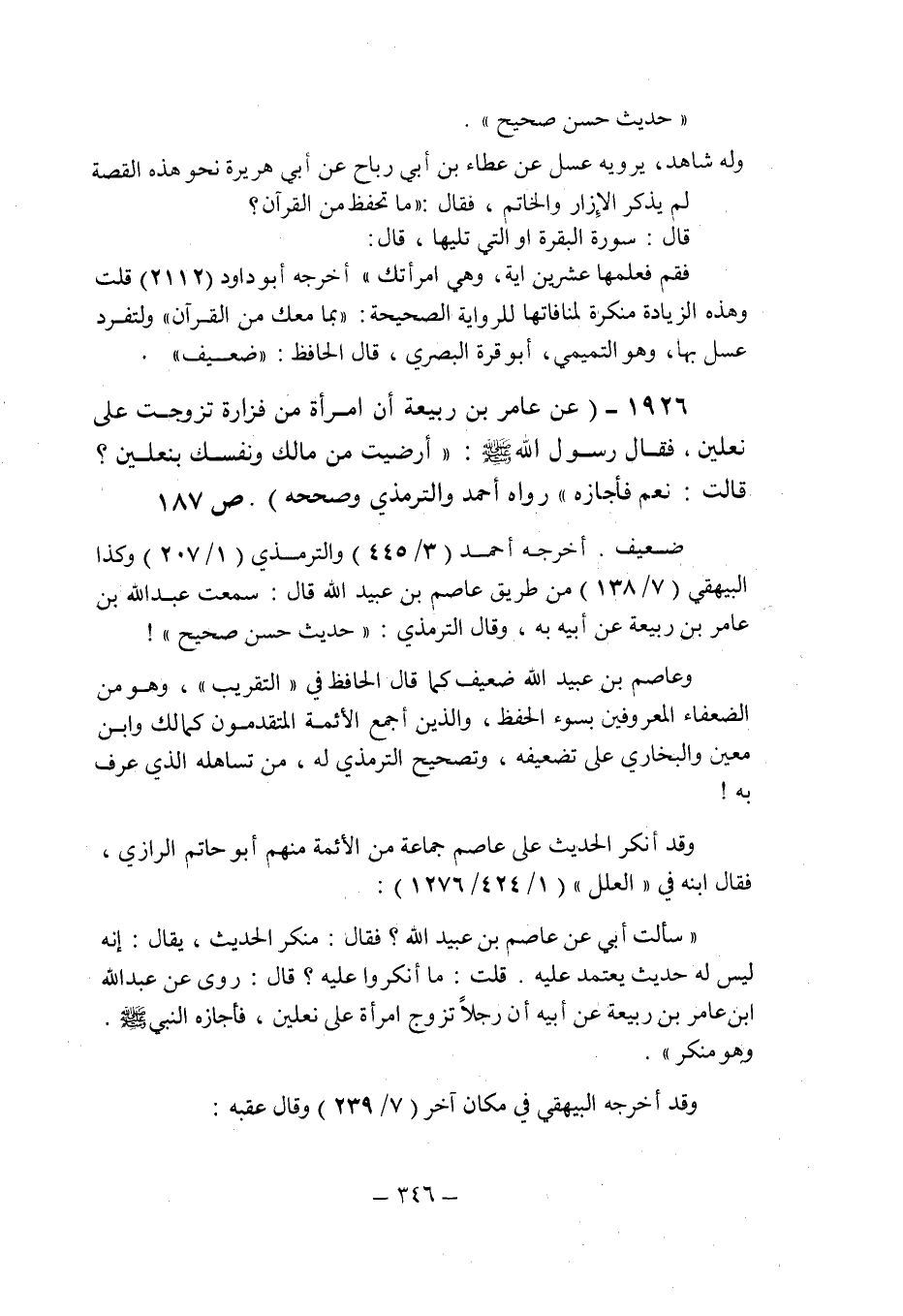 (1926) - (عن عامر بن ربيعة أن امرأة من فزارة تزوجت على نعلين , فقال رسول الله صلى الله عليه وسلم: " أرضيت من مالك ونفسك بنعلين؟ قالت: نعم فأجازه " رواه أحمد والترمذى وصححه (ص 187) .