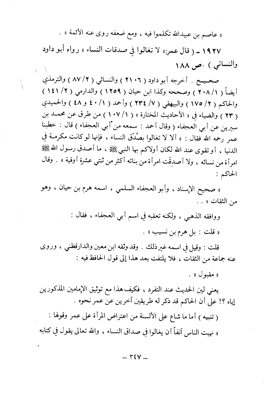 (1927) - (قال عمر: " لا تغالوا فى صدقات النساء " رواه أبو داود والنسائى (ص 188) .