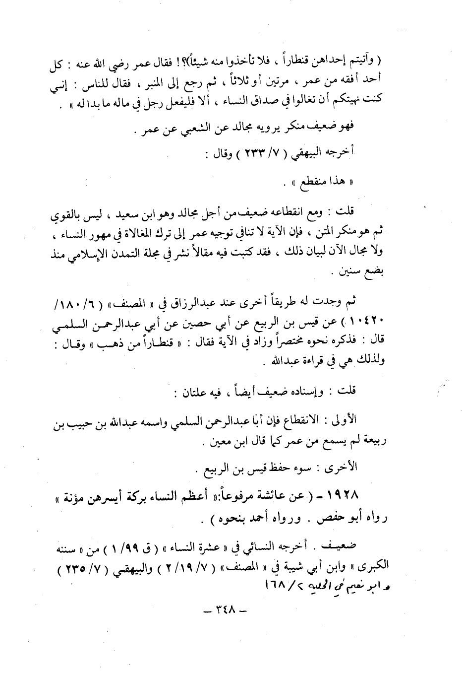 قلت: ومع انقطاعه ضعيف من أجل مجالد وهو ابن سعيد , ليس بالقوى ثم هو منكر المتن , فإن الآية لا تنافى توجيه عمر إلى ترك المغالاة فى مهور النساء , ولا مجال الآن لبيان ذلك , فقد كتبت فيه مقالا نشر فى مجلة التمدن الإسلامى منذ بضع سنين.
