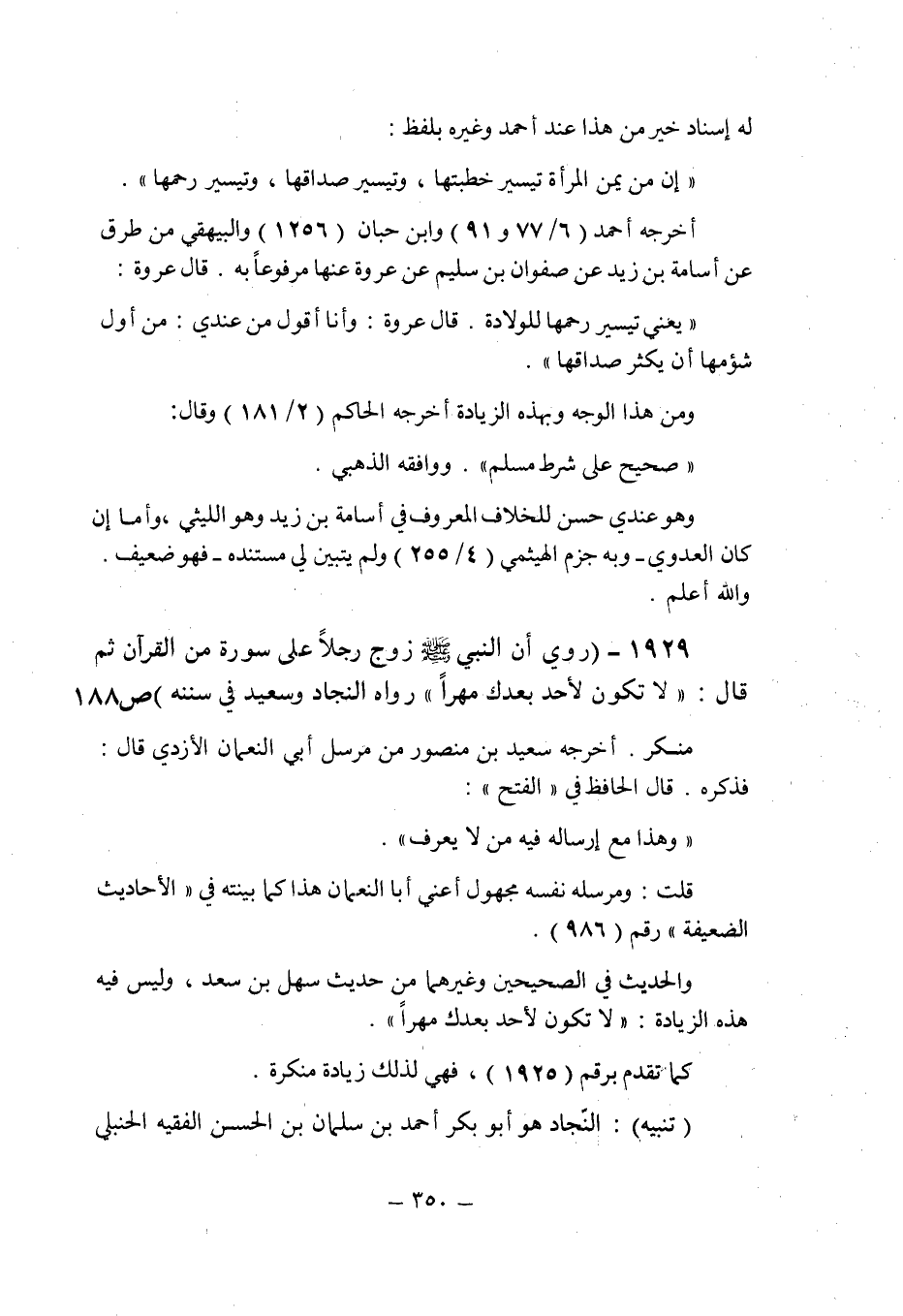 (1929) - (روى أن النبى صلى الله عليه وسلم زوج رجلا على سورة من القرآن ثم قال: " لا تكون لأحد بعدك مهرا " رواه النجاد وسعيد فى سننه (ص 188) .