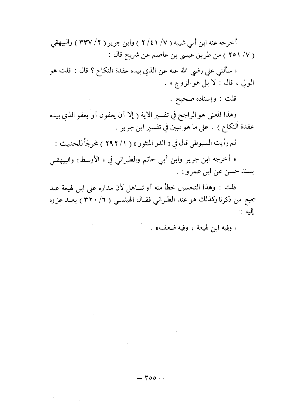 أخرجه عنه ابن أبى شيبة (7/41/2) وابن جرير (2/337) والبيهقى (7/251) من طريق عيسى بن عاصم عن شريح قال: " سألنى على رضى الله عنه عن الذى بيده عقدة النكاح؟ قال: قلت هو الولى , قال: لا بل هو الزوج ".