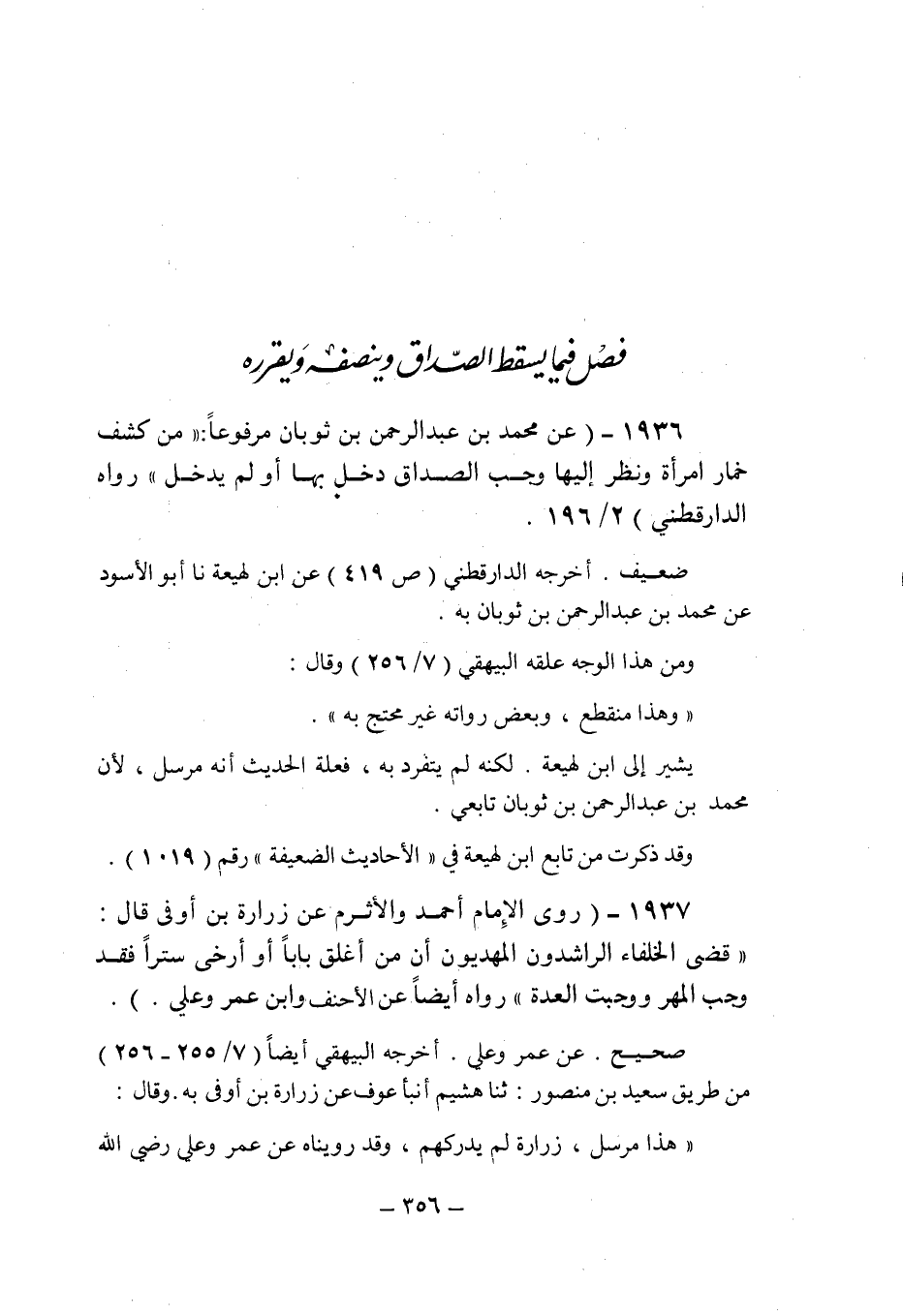 (1936) - (عن محمد بن عبد الرحمن بن ثوبان مرفوعا: " من كشف خمار امرأة ونظر إليها وجب الصداق دخل بها أو لم يدخل " رواه الدارقطنى (2/196) .