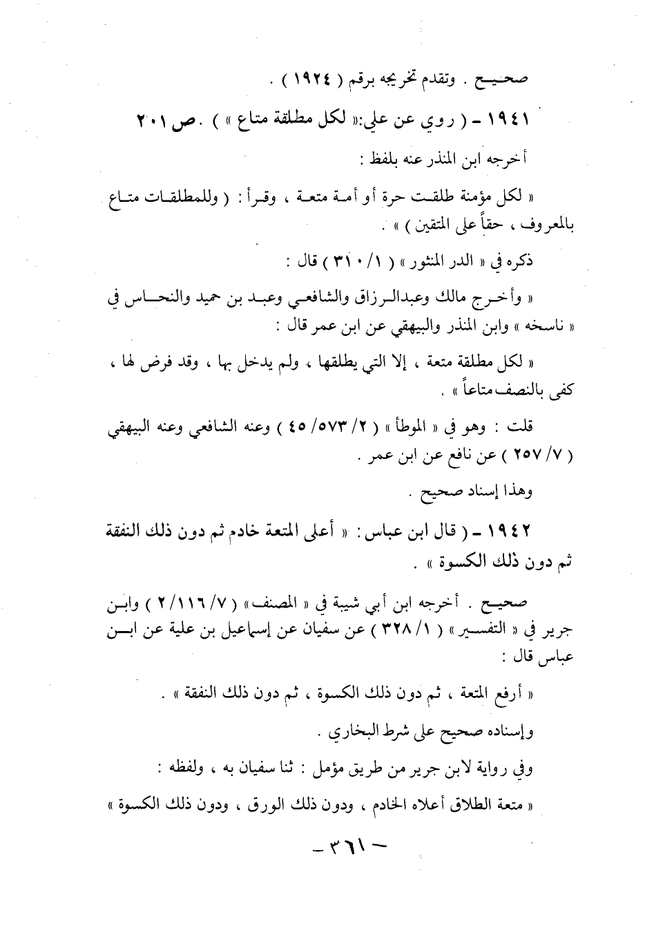 (1941) - (روى عن على: " لكل مطلقة متاع " (ص 201) .