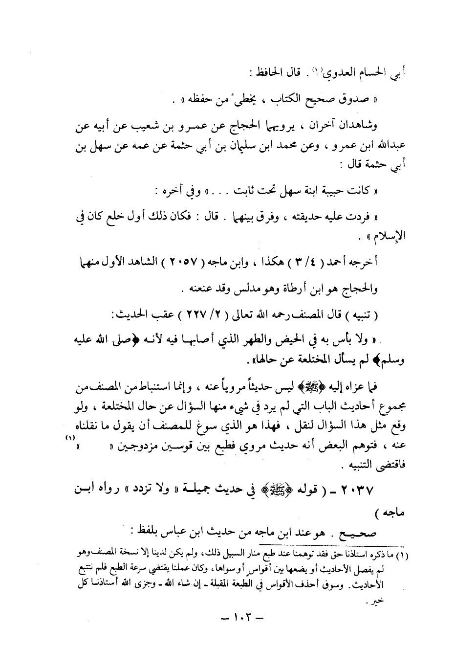 (1) ما ذكره استاذنا حق فقد توهمنا عند طبع منار السبيل ذلك، ولم يكن لدينا إلا نسخة المصنف وهو لم يفصل الأحاديث أو يضعها بين أقواس أو سواها، وكان عملنا يقتضي سرعة الطبع فلم نتتبع الأحاديث. وسوف أحذف الأقواس في الطبعة المقبلة - إن شاء الله - وجزى الله أستاذنا كل خير.