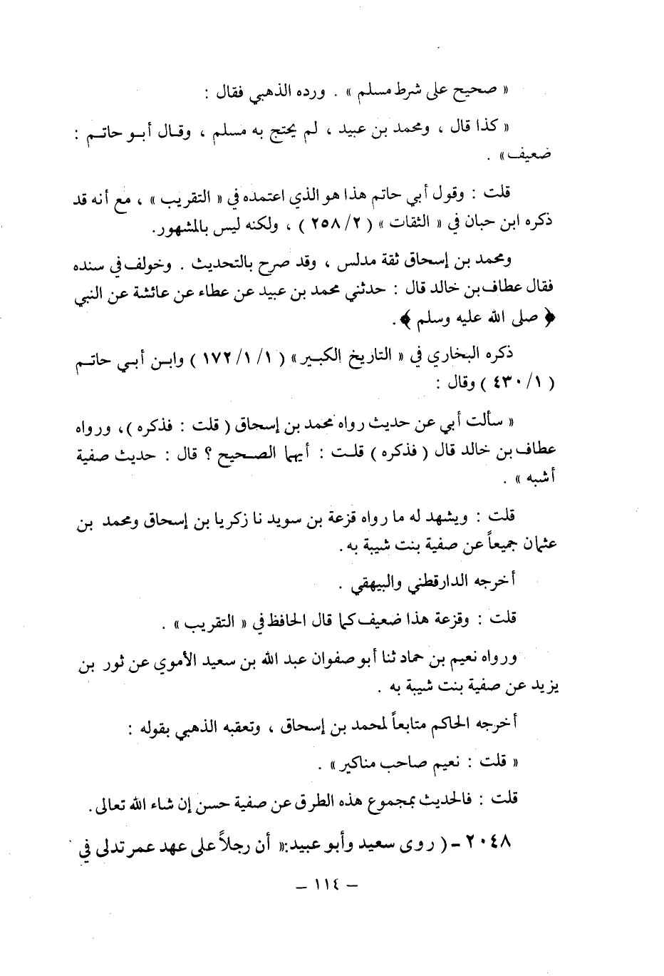 ورده الذهبى فقال: " كذا قال , ومحمد بن عبيد , لم يحتج به مسلم , وقال أبو حاتم: ضعيف ".