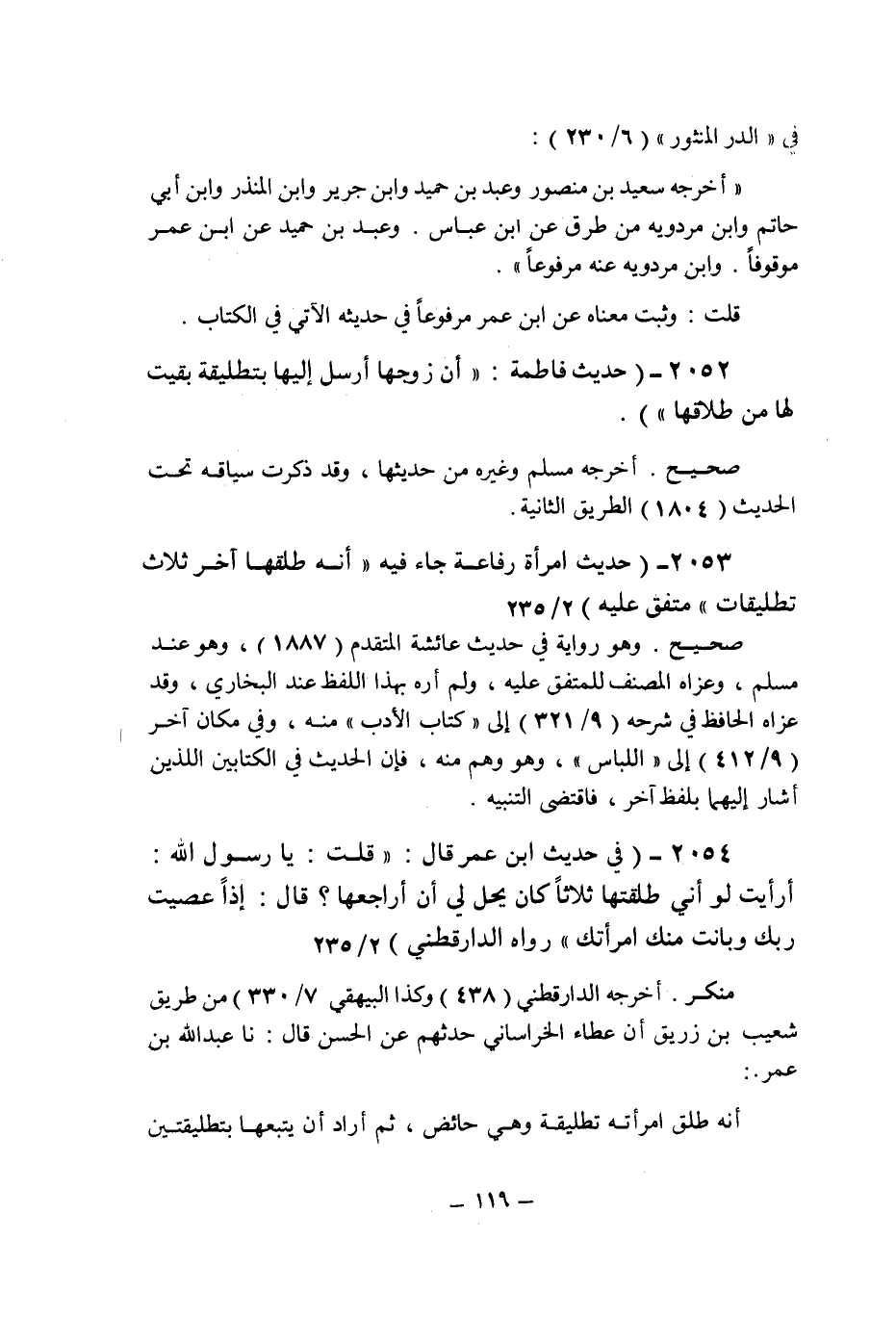 (2054) - (فى حديث ابن عمر قال: " قلت: يا رسول الله: أرأيت لو أنى طلقتها ثلاثا كان يحل لى أن أراجعها؟ قال: إذا عصيت ربك وبانت منك امرأتك " رواه الدارقطنى (2/235) .
