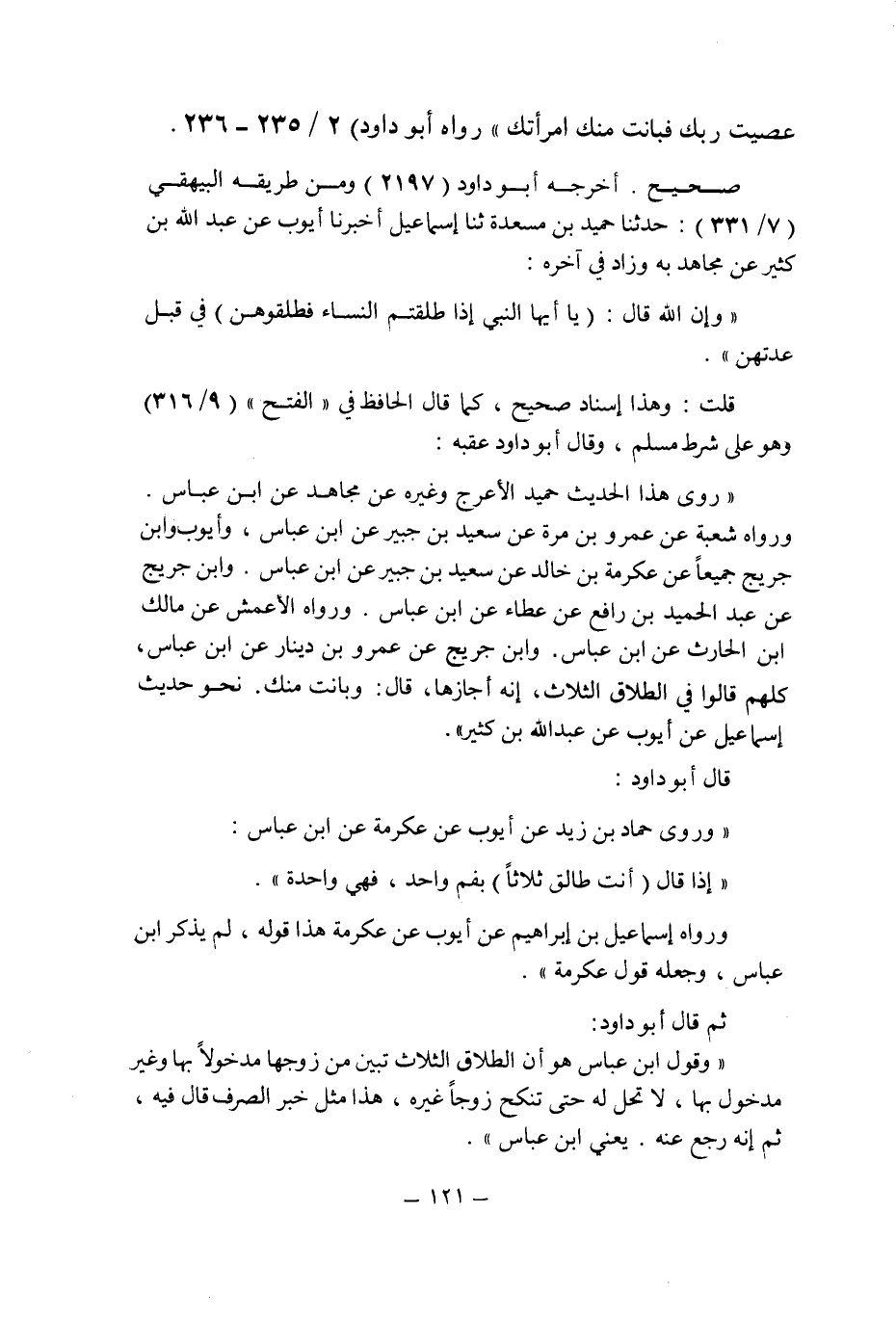 قال أبو داود: " وروى حماد بن زيد عن أيوب عن عكرمة عن ابن عباس: " إذا قال (أنت طالق ثلاثا) بفم واحد , فهى واحدة ".